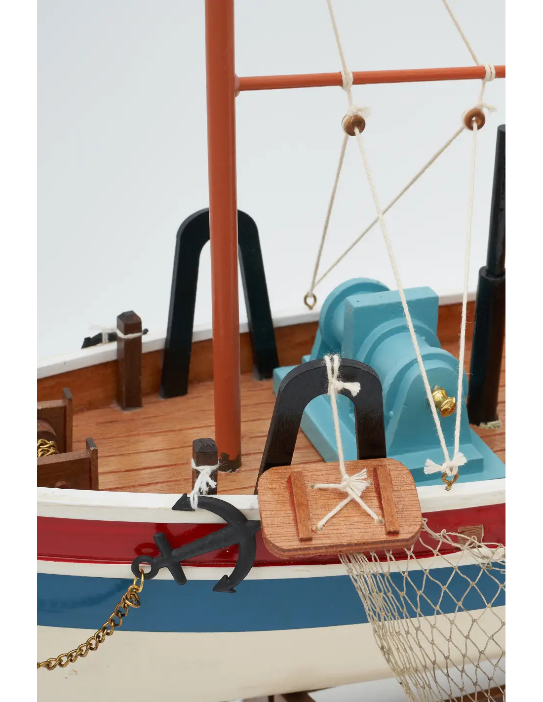 Maqueta de barco de un pesquero elaborado artesanalmente en madera y en colores rojo, azul y blanco con tonos marinos.