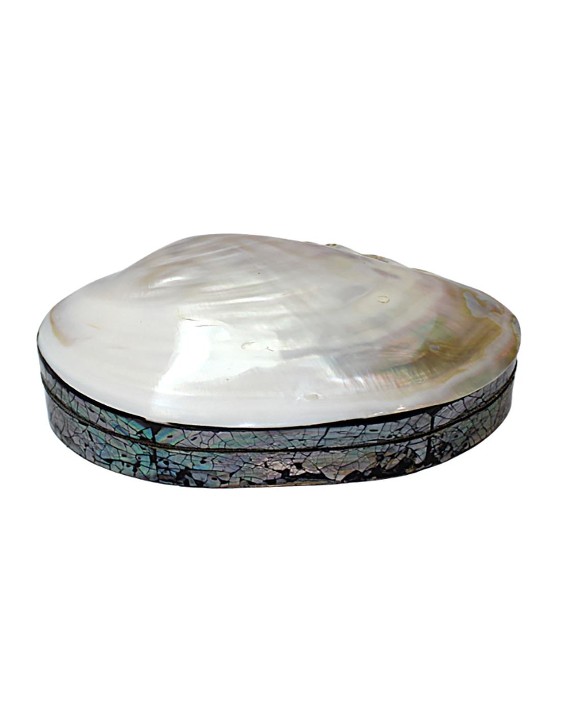Estuche náutico hecho con una concha nacarada de haliotis y abalon, forrada por dentro de terciopelo negro. La caja marinera o joyero se fabrica partir de la concha con lo que no hay dos iguales.