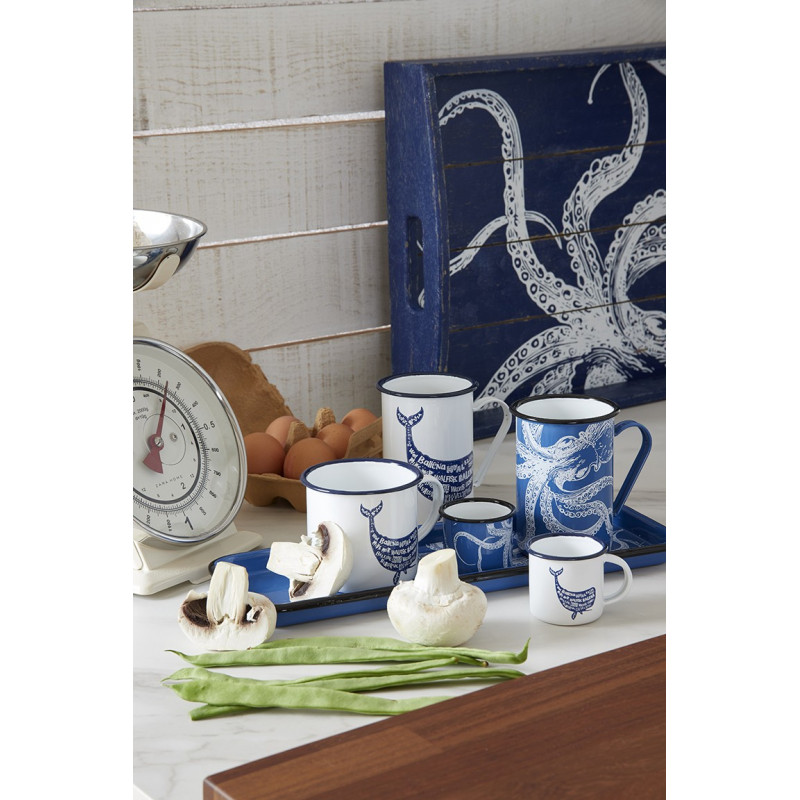 Bandeja marinera pulpo náutico de forma rectangular. Hecha artesanalmente en madera y pintada en azul marino con pulpo decorativo. Muy ligera y de fácil transporte, con aberturas laterales para un cómodo agarre. De diseño vistoso, ideal para llevar todo tipo de vajilla náutica y para decorar el ambiente de la cocina con un toque navy. Excelente opción como complemento de la vajilla marinera en la disposición de mesas de estilo náutico.