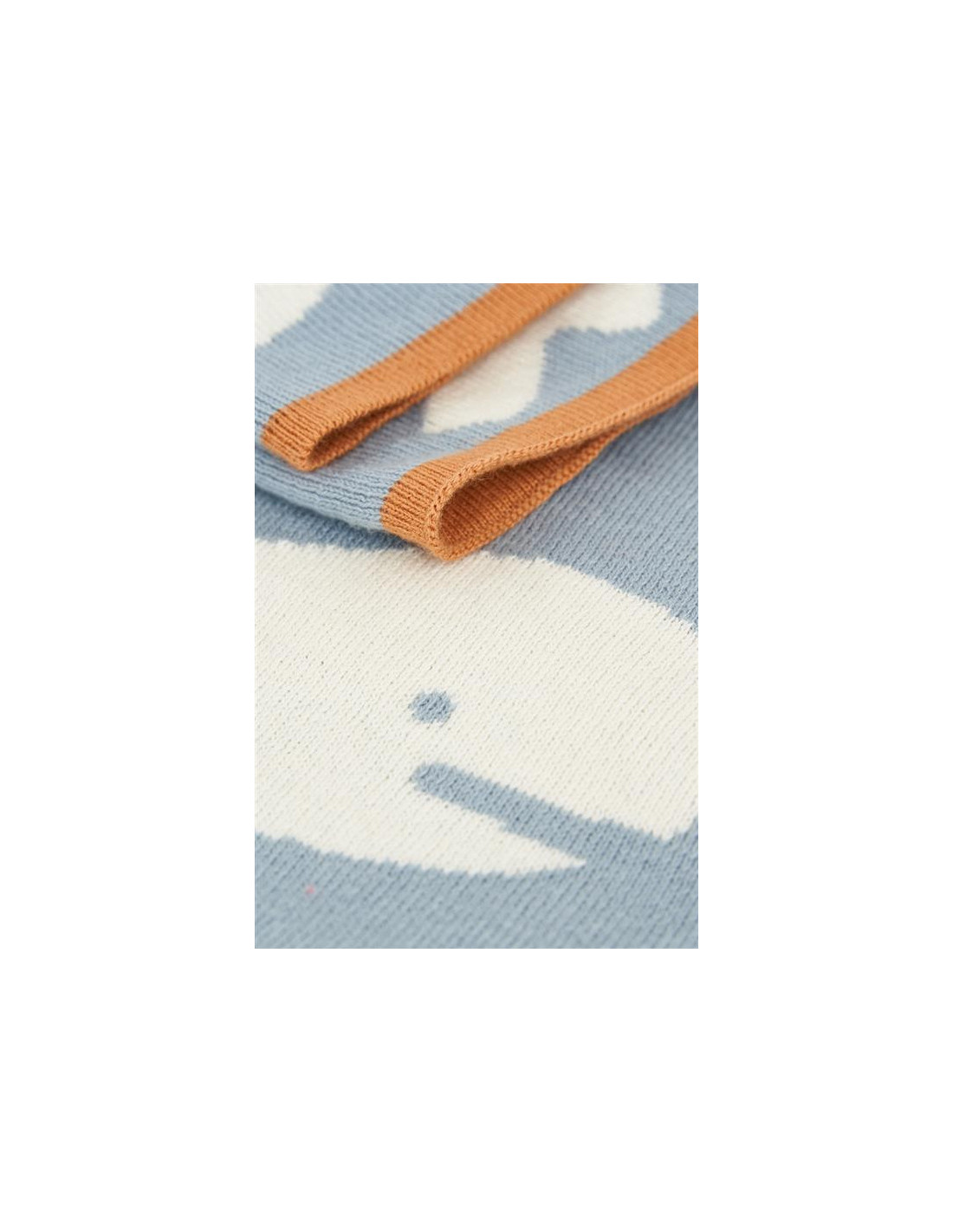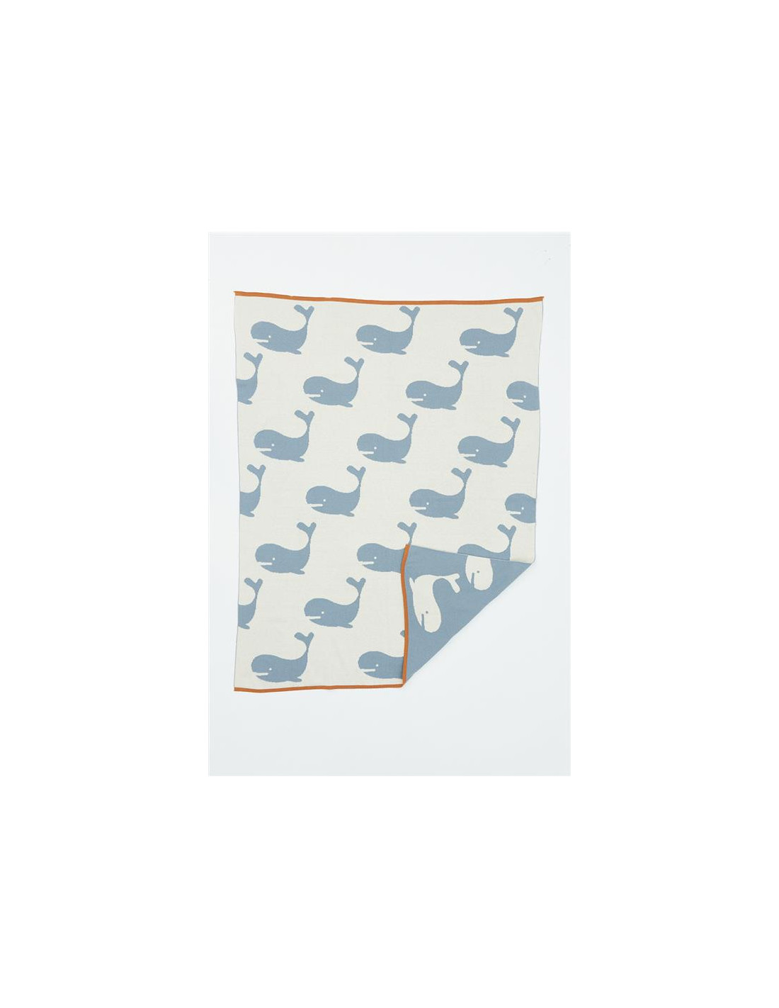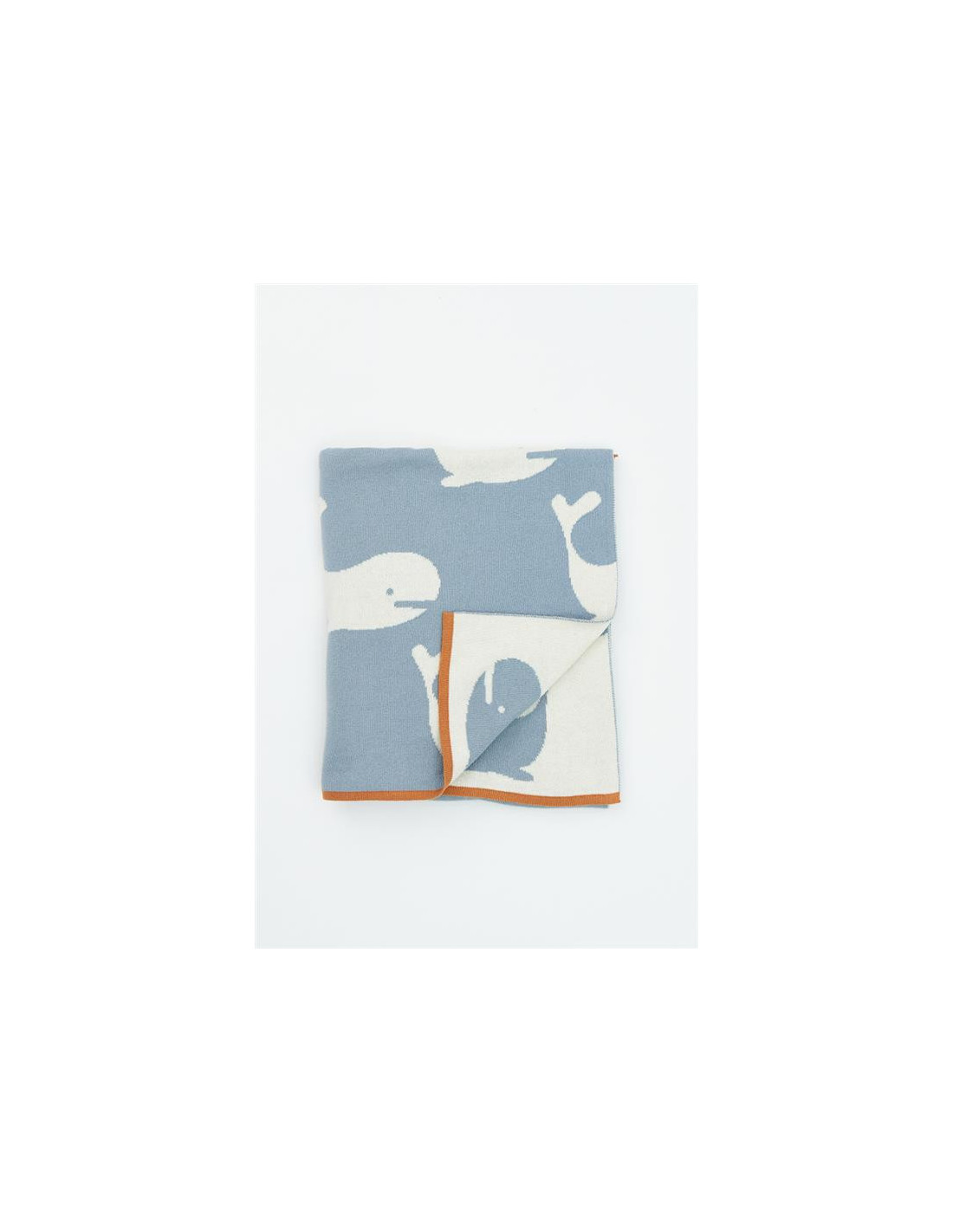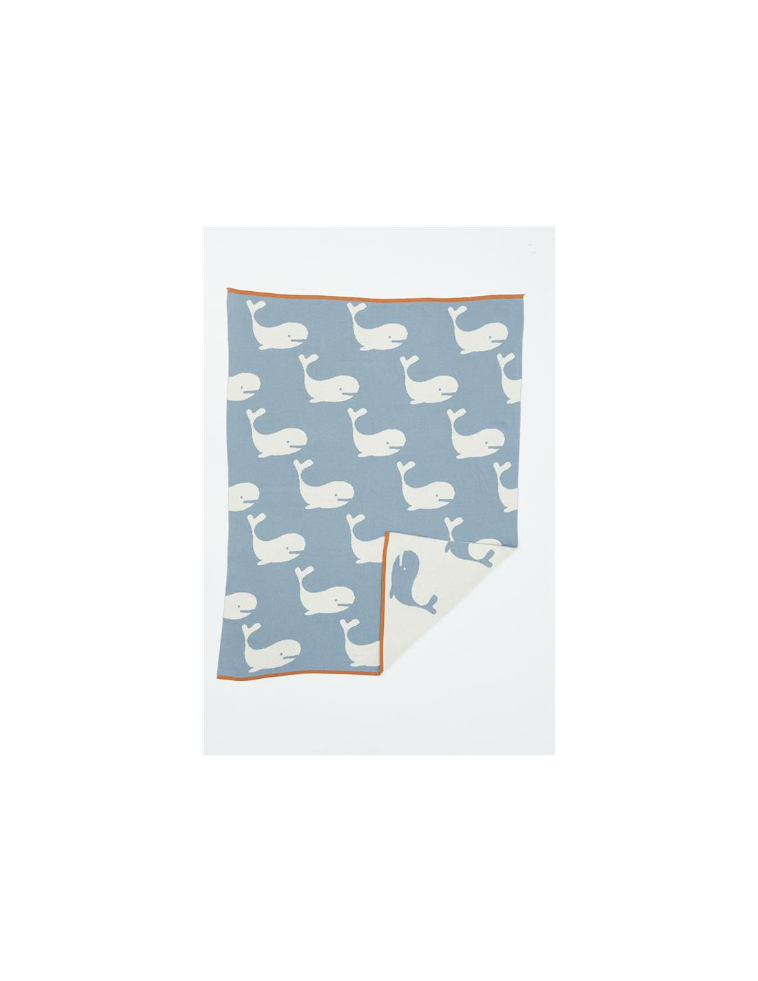 Una manta de algodón suave con diseño reversible de ballena en tonos azules y blancos, perfecta para añadir un toque marino a tu espacio.
