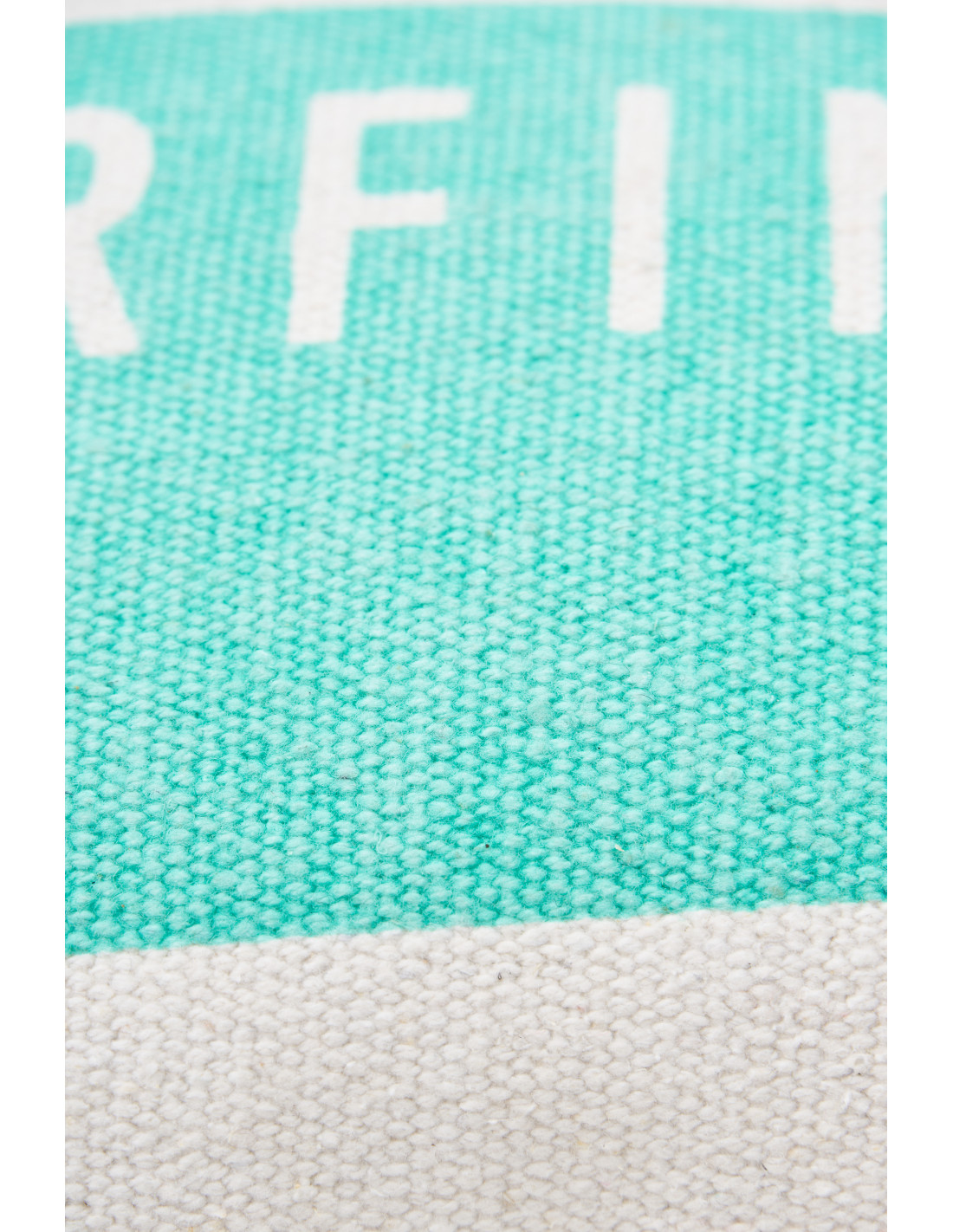 Cojín rectangular blanco con el diseño de una tabla de surf turquesa en pleno surfing, bordeado en azul y fácil de lavar. Ideal para añadir un toque surfero y fresco a tu espacio.