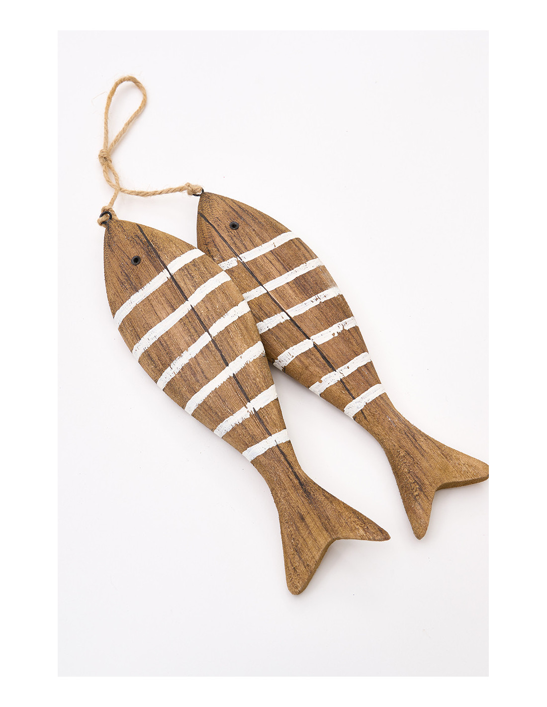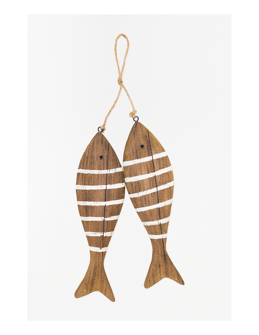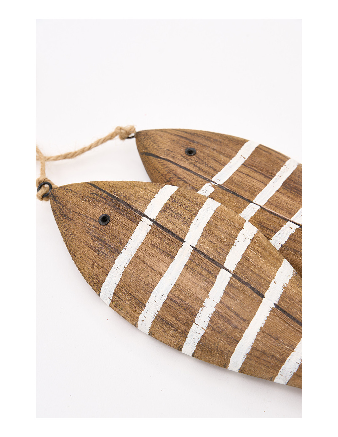 Inspirados en el mundo marino, estos dos peces de madera forman una ristra colgante con un diseño a rayas blancas que resalta su estética náutica. Su acabado rústico y la cuerda de color natural refuerzan su aspecto artesanal, convirtiéndolos en un adorno ideal para ambientes costeros o de estilo mediterráneo.