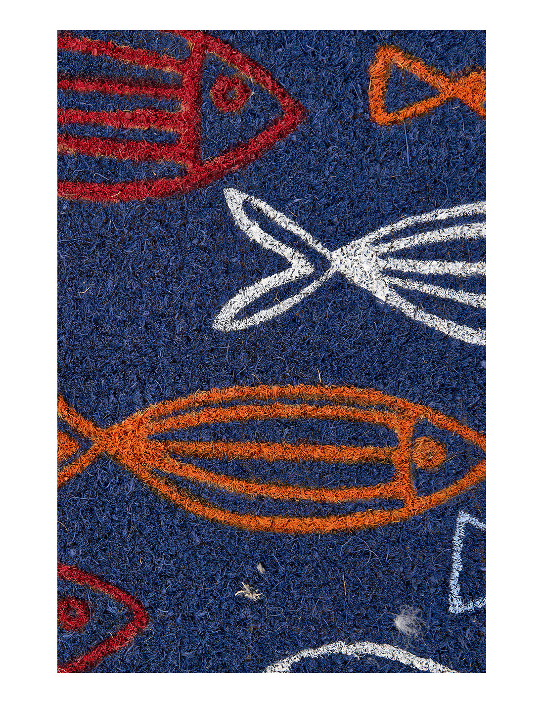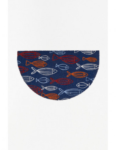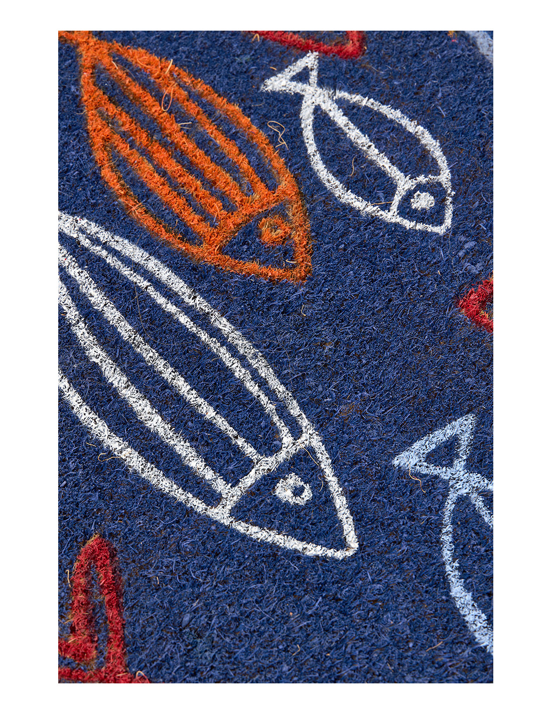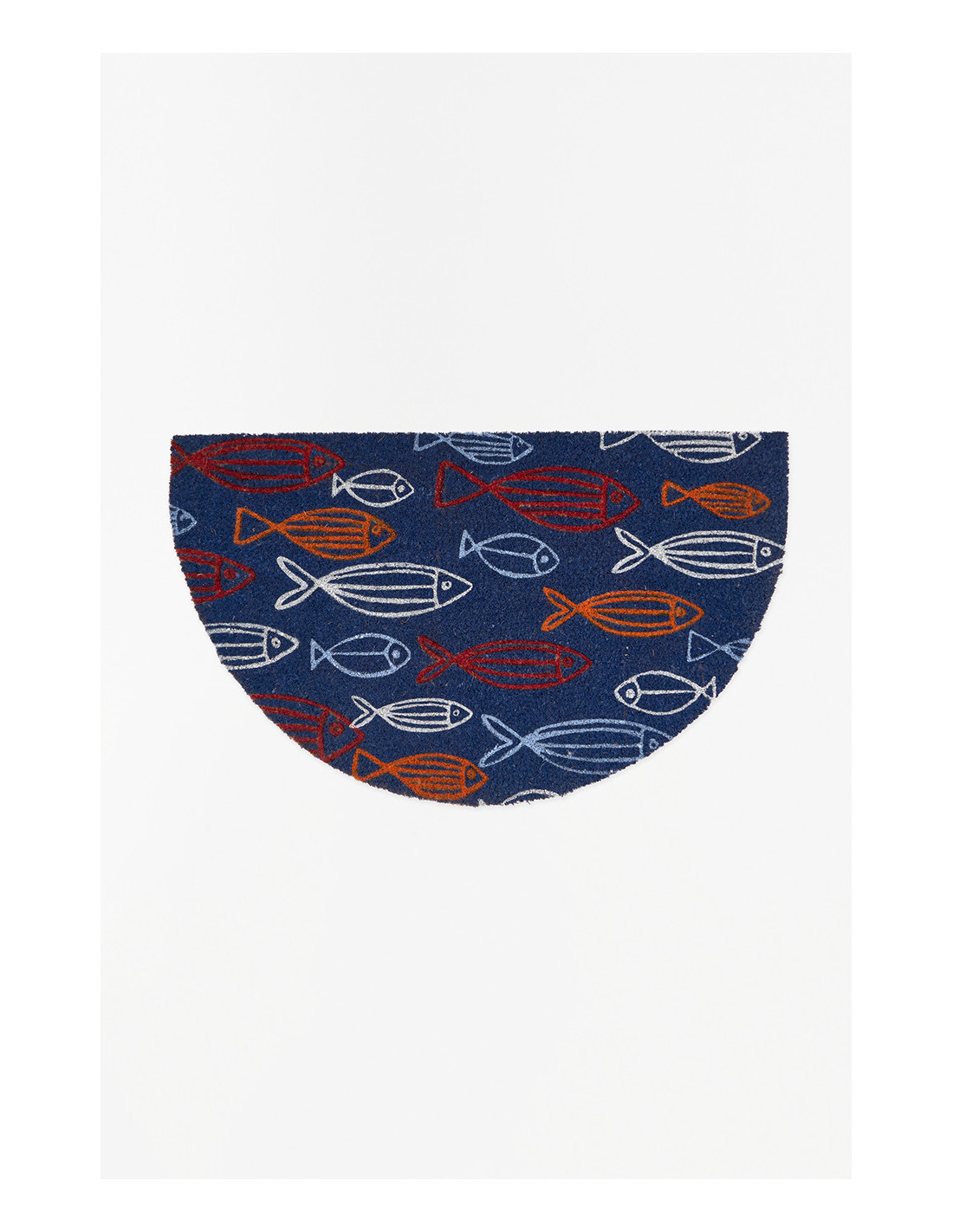 Este felpudo semicircular, elaborado en fibra de coco natural, combina funcionalidad y estética marinera. Su diseño de banco de peces y su material resistente lo convierten en una opción duradera y decorativa para la entrada.