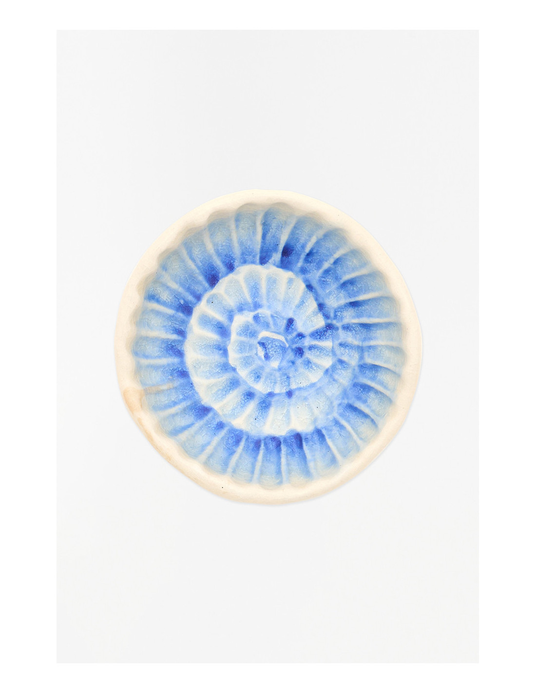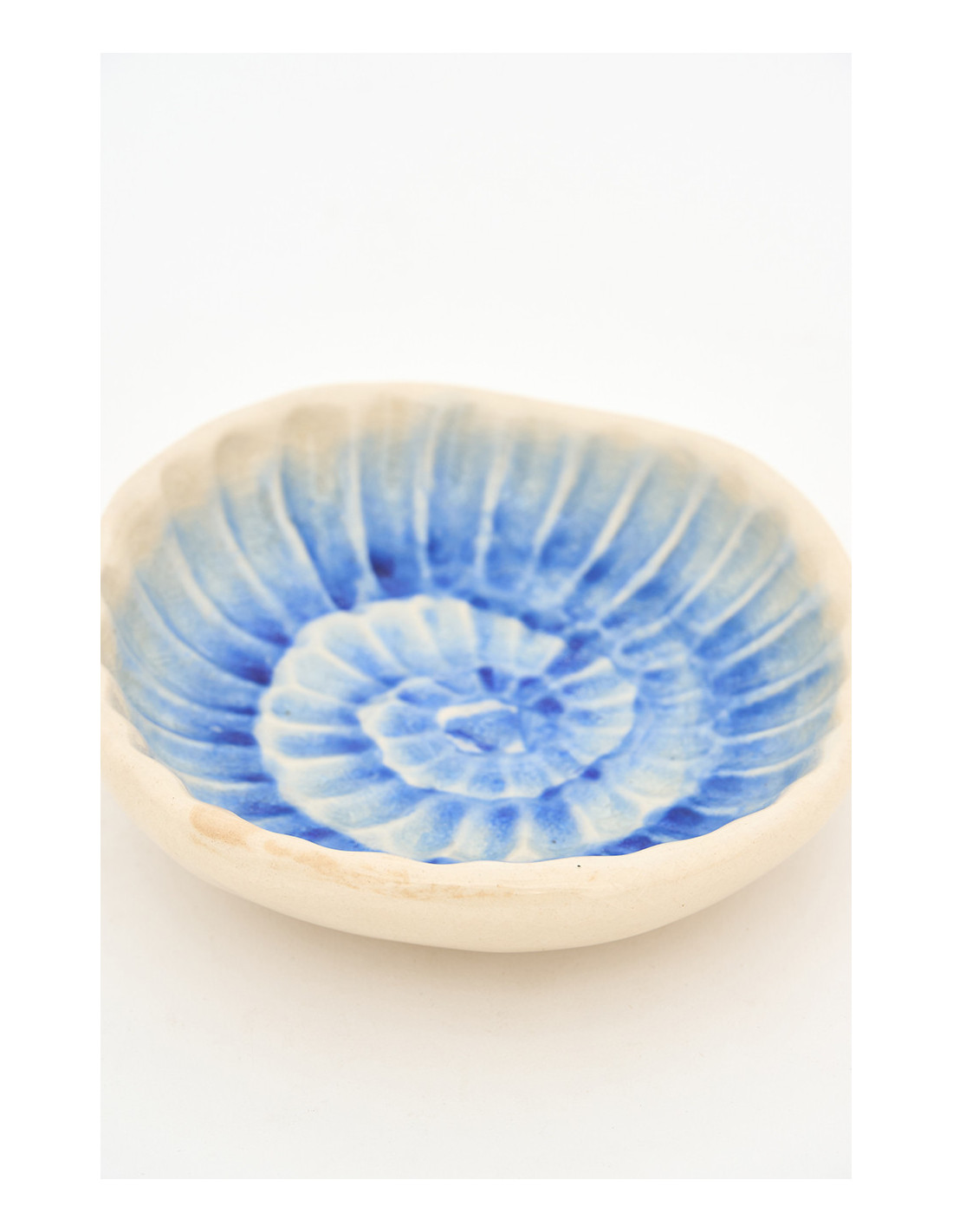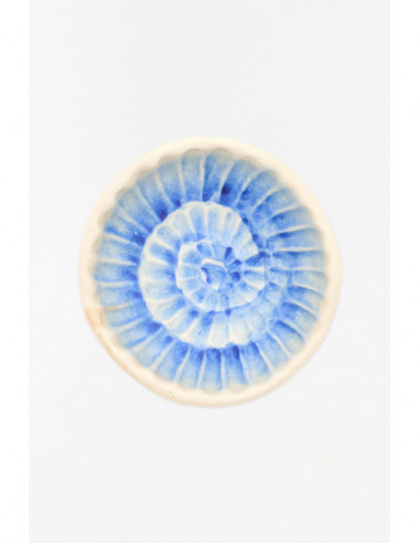 Este bol cerámico de tamaño compacto presenta una caracola azul con un diseño sutilmente en relieve. Su acabado artesanal le da un encanto único y especial.