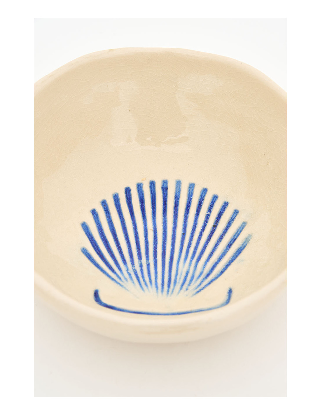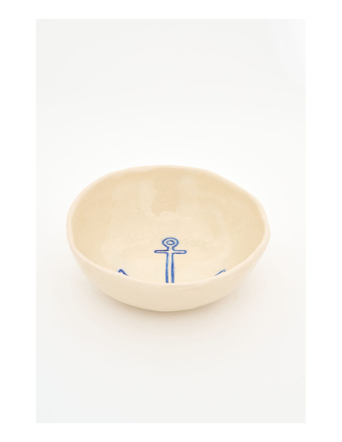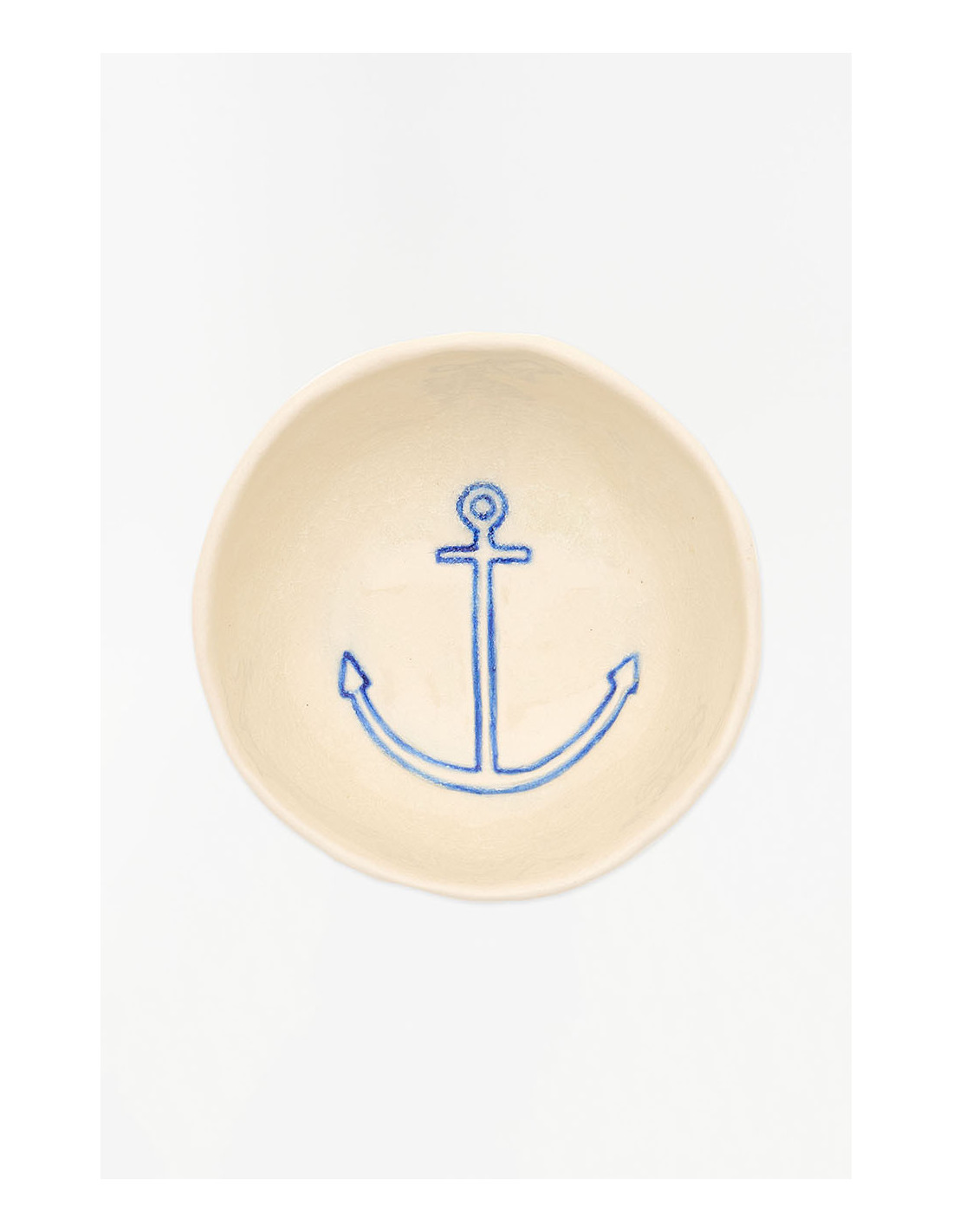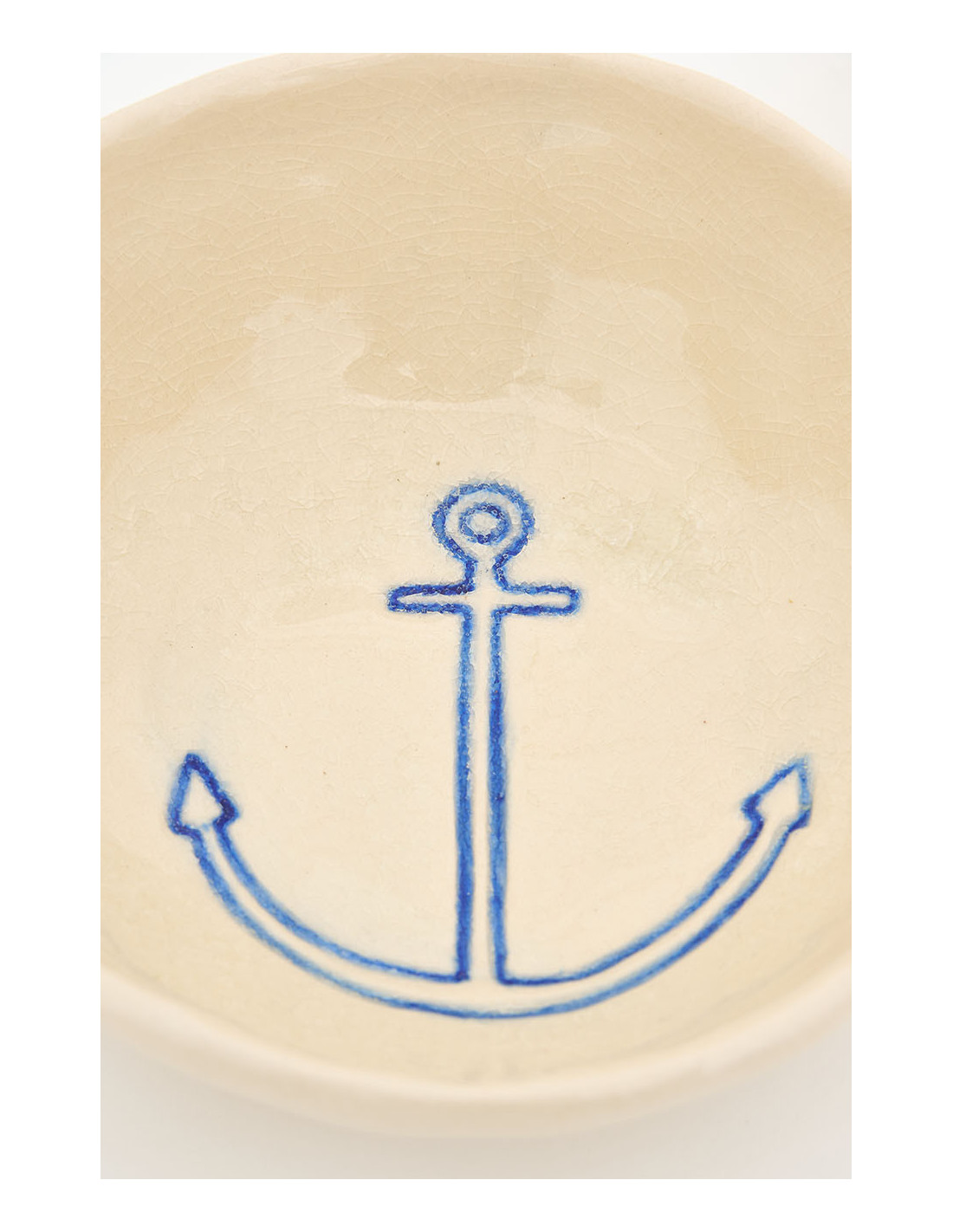 Este bol de gres presenta un diseño único con un ancla y una caracola y ancla, ambos trazados con líneas azulinas. Su acabado envejecido aporta carácter y estilo a tu vajilla, ideal para quienes buscan detalles originales.