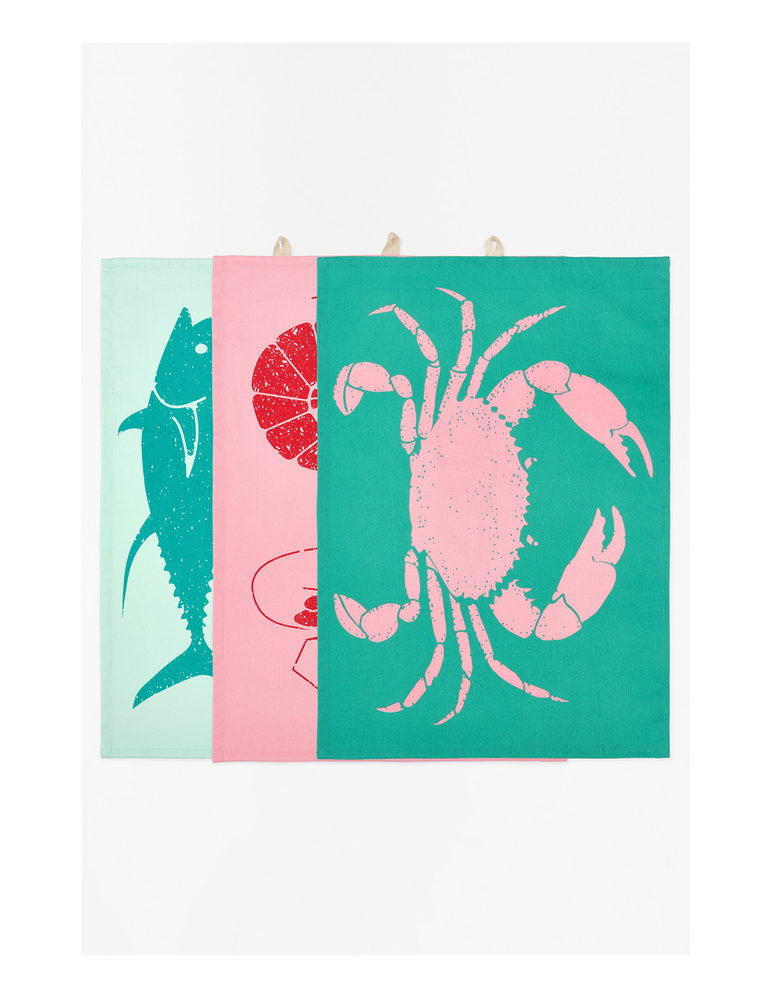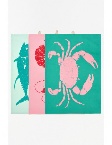 Trapos de cocina elaborados en algodón Drill grueso, decorados con bordados artesanales de cangrejo, pez y langosta. Un set funcional y decorativo que transmite encanto náutico.