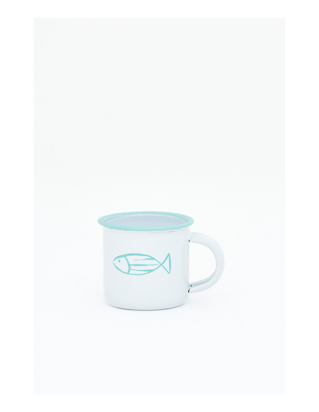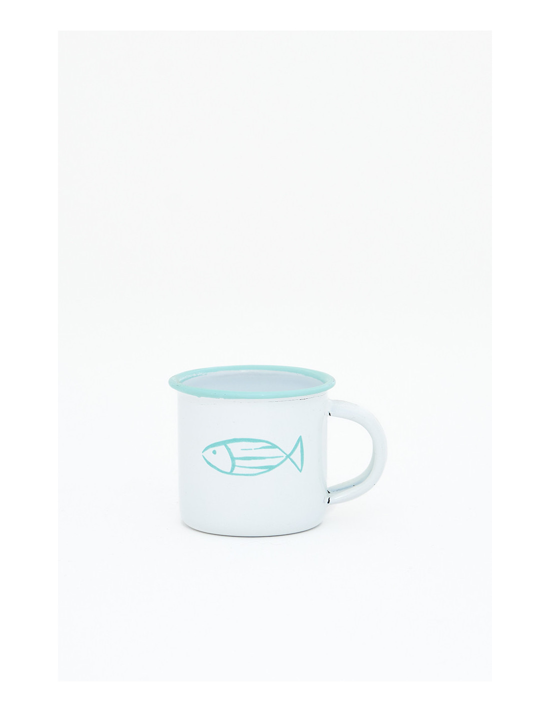 Añade un detalle náutico a tu vajilla con este mini mug de metal esmaltado, perfecto para servir café o infusiones en pequeñas dosis. Su diseño presenta un pez pintado con precisión en el centro, resaltado sobre un fondo blanco limpio y brillante.
