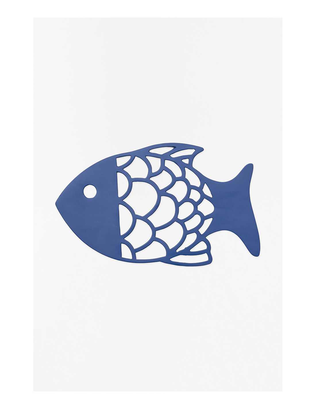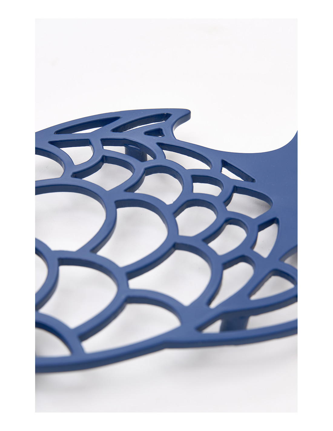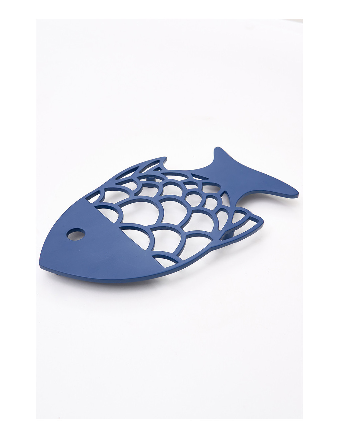 Dale un toque náutico a tu mesa con este salvamantel de aluminio azul en forma de pez. Su diseño con escamas perforadas combina funcionalidad y elegancia costera.
