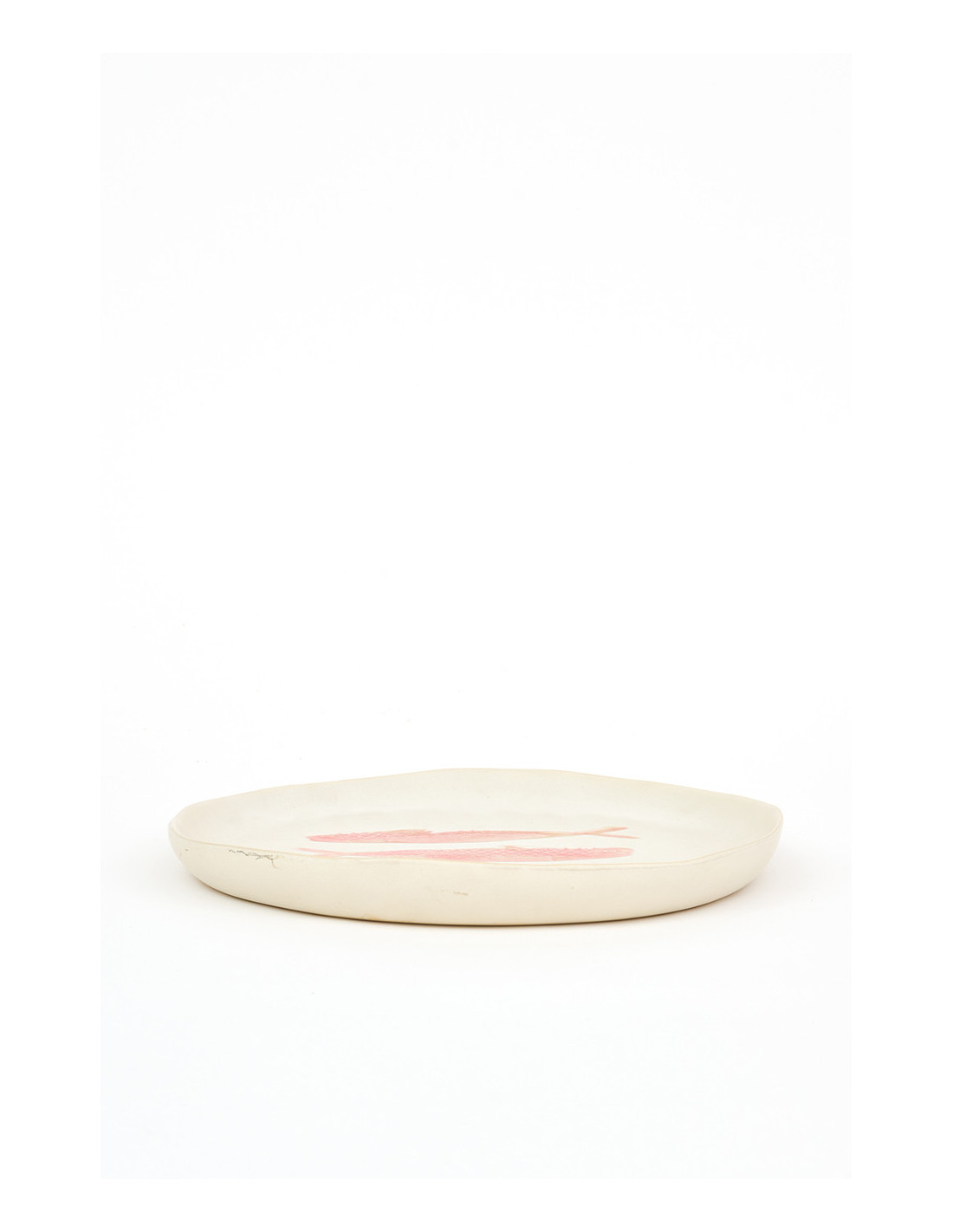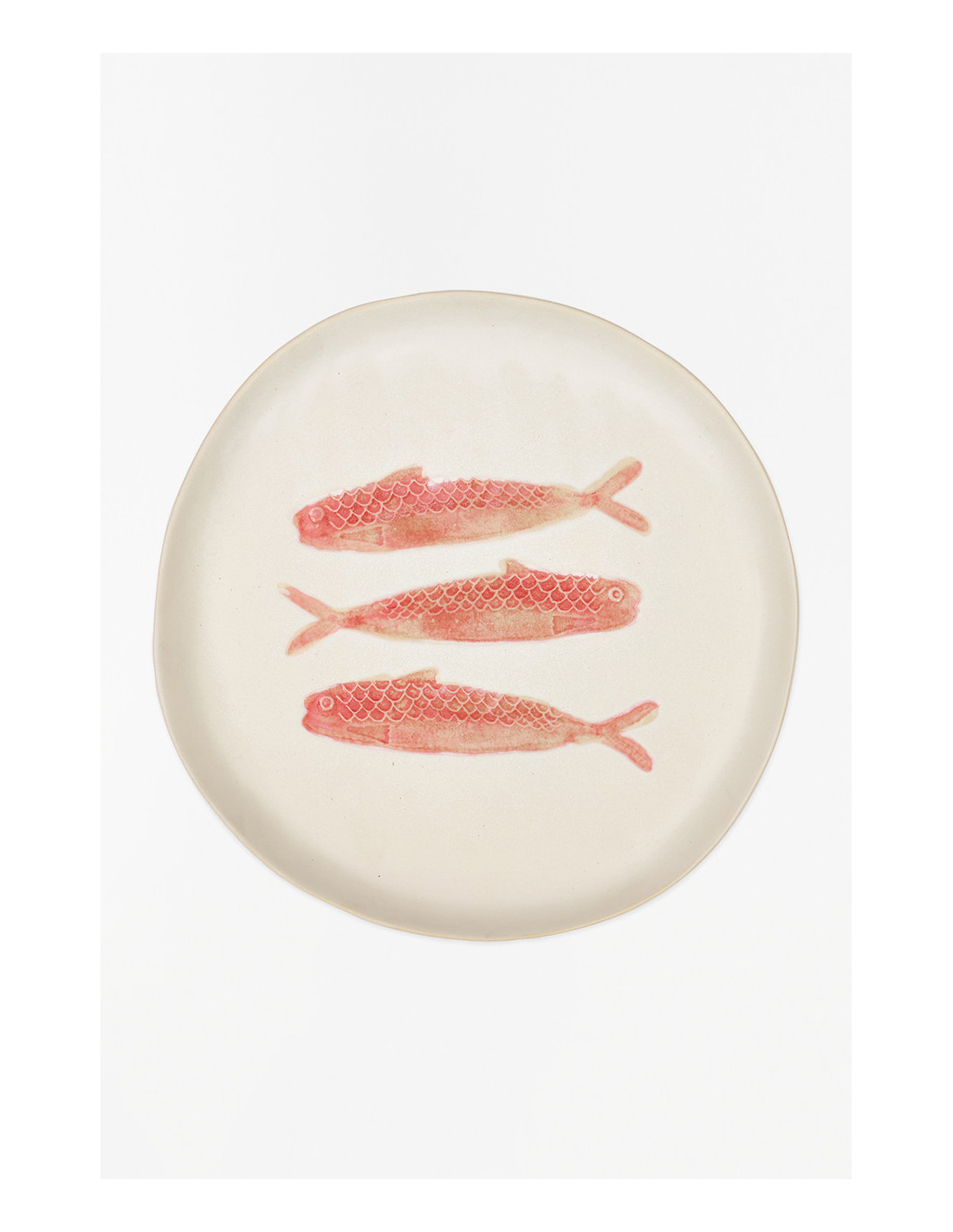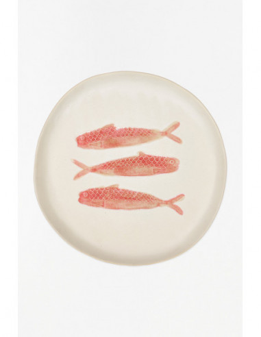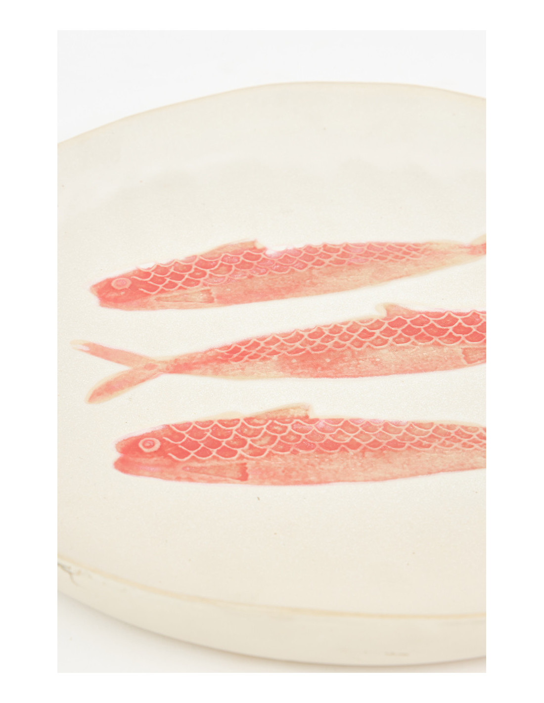 Una pieza perfecta para los amantes del mar: plato cerámico beige con dibujos de peces rojizos. Aporta frescura, es resistente y combina funcionalidad con un diseño encantador.