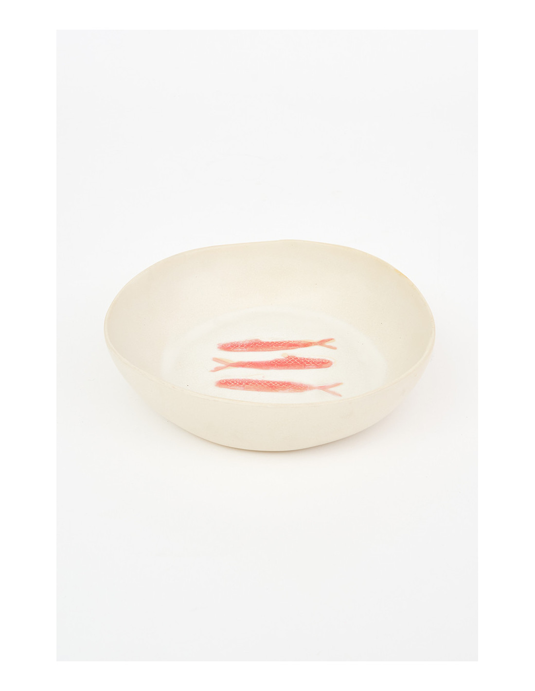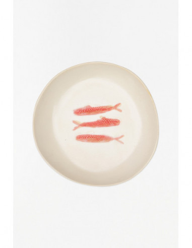 Con un diseño inspirado en el estilo náutico, este bol semiplano de cerámica combina funcionalidad y estética. El acabado beige contrasta de forma armoniosa con los peces rojizos del centro, creando una pieza decorativa y práctica a la vez.