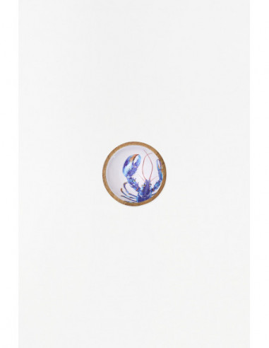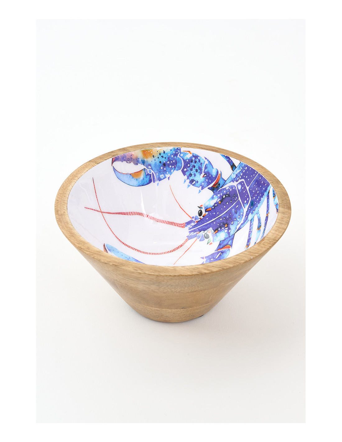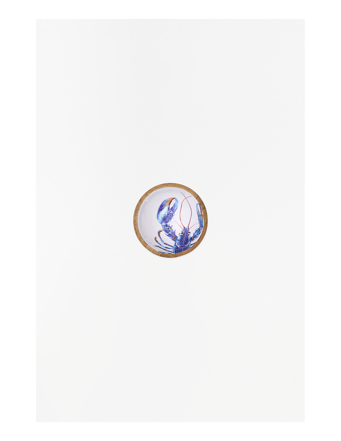 Diseñado con una estética marinera y elaborado en madera esmaltada, este bol hondo con forma redonda presenta en su interior una elegante langosta azul que añade carácter a cualquier presentación.