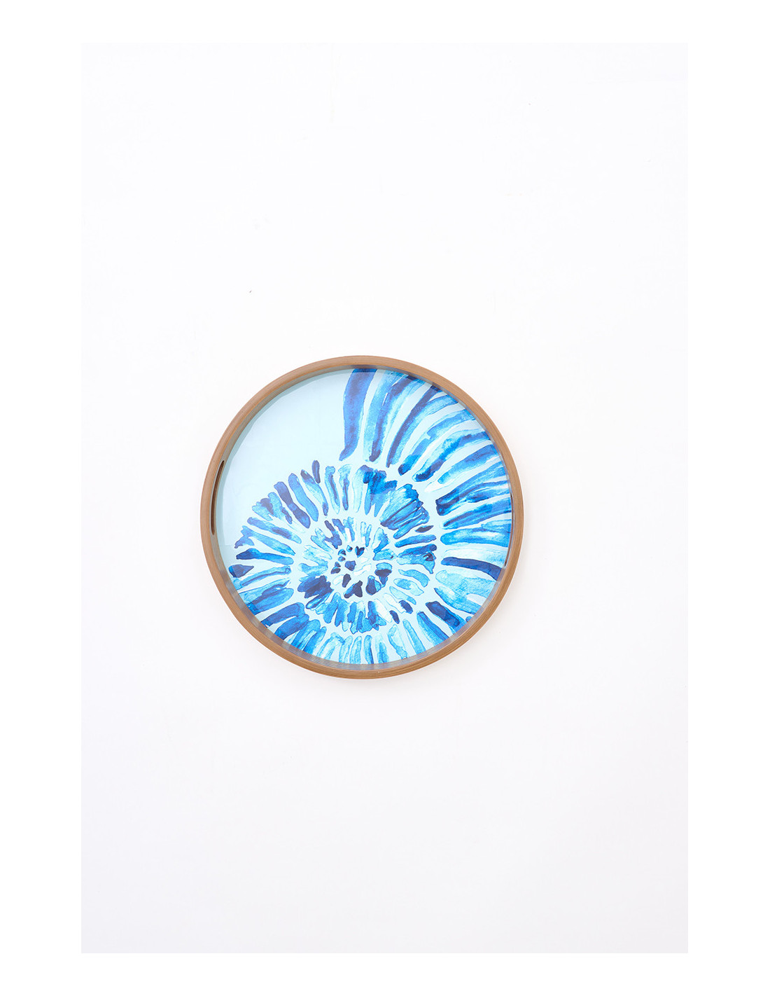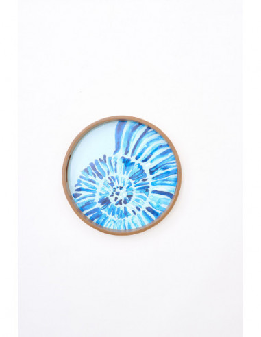Bandeja decorativa de madera esmaltada con una delicada caracola pintada en el centro, ideal para amantes del estilo marinero. Su tamaño mediano la hace versátil tanto para servir aperitivos como para utilizarla como base decorativa.