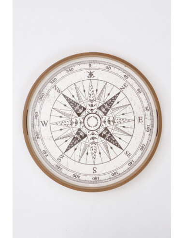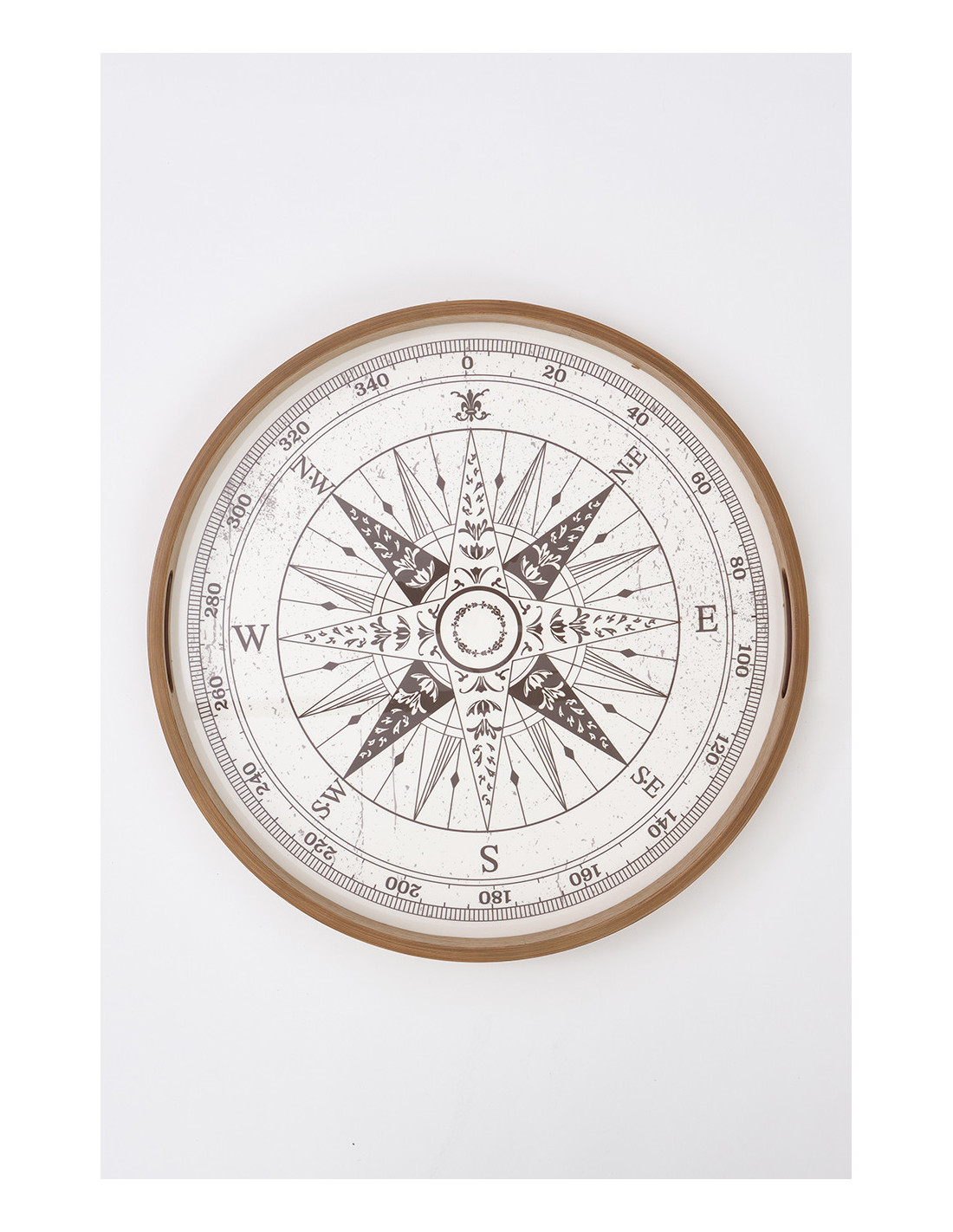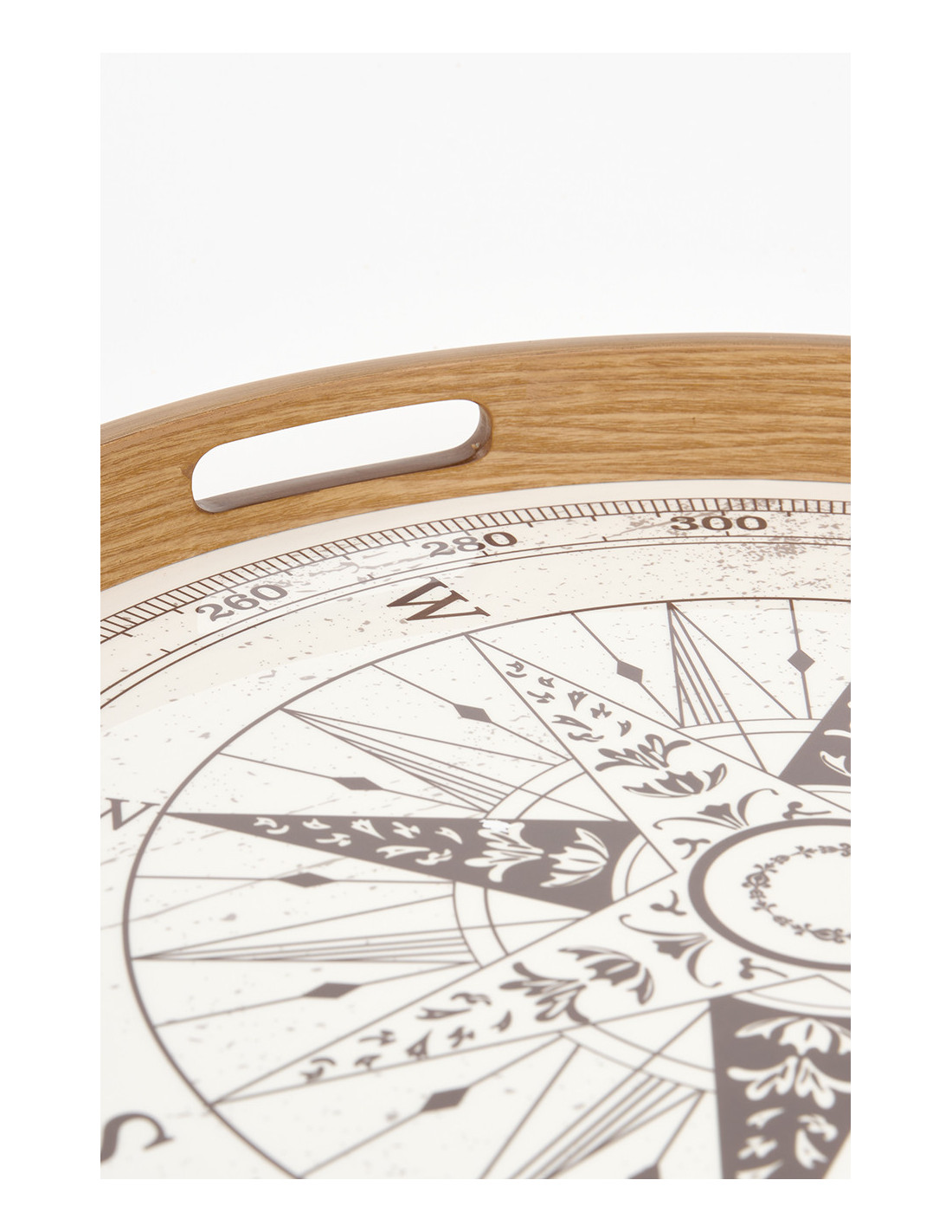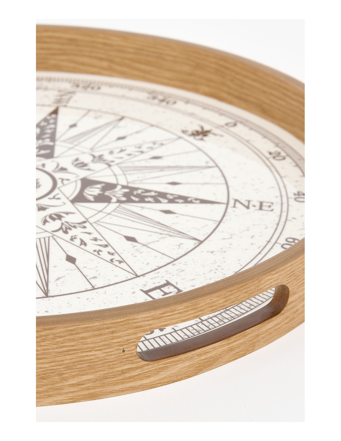 Ideal para quienes buscan piezas con carácter náutico, esta bandeja grande combina diseño y practicidad. Hecha en madera esmaltada de gran resistencia, presenta una rosa de los vientos sobre un fondo blanco, decorada con finas líneas negras que evocan mapas de navegación.