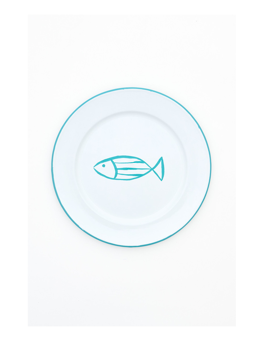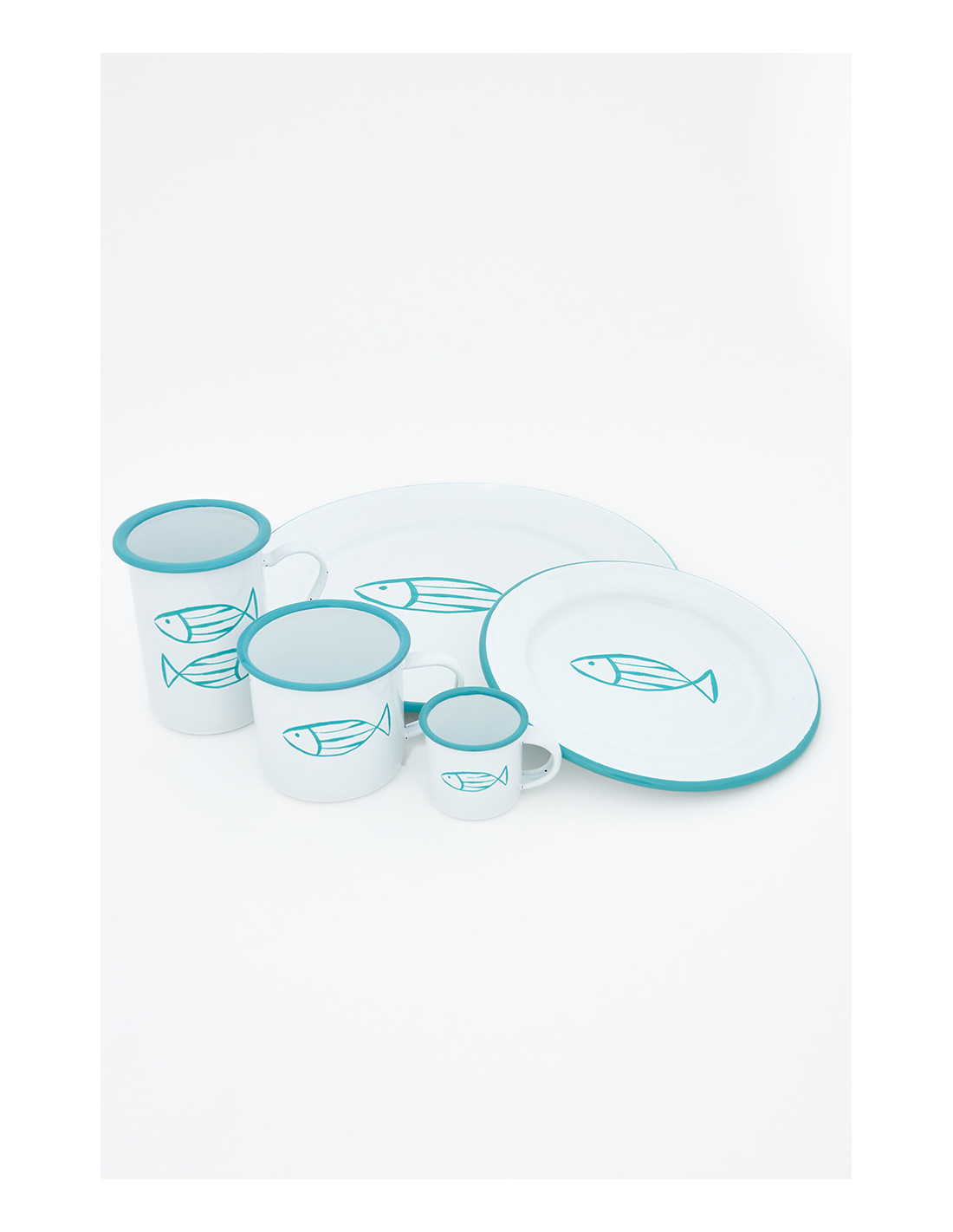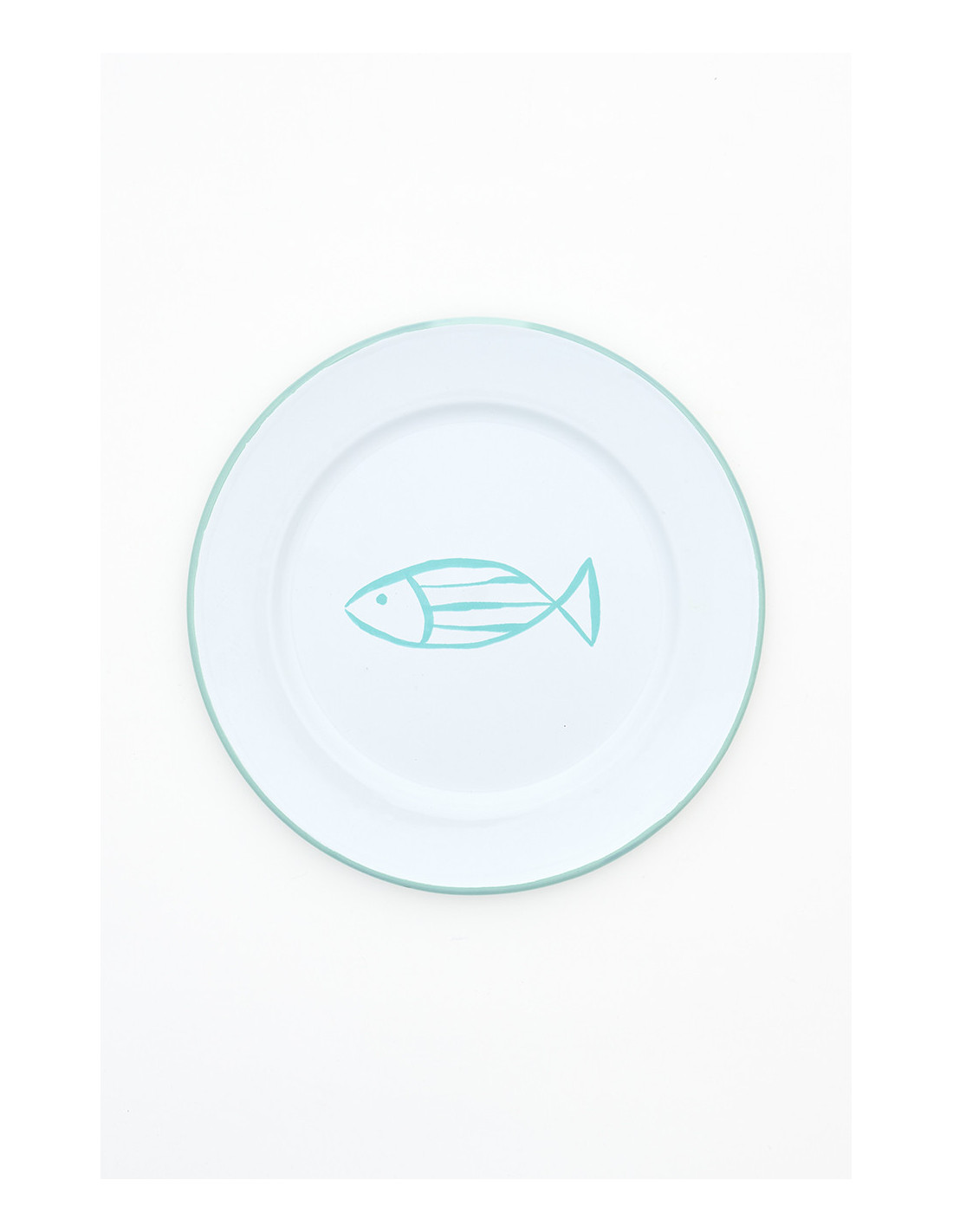 Platos grandes de metal esmaltado con un pez en el centro son ideales para darle frescura a tu mesa. Disponibles en colores celeste, azul, verde y turquesa, son duraderos y fáciles de limpiar.