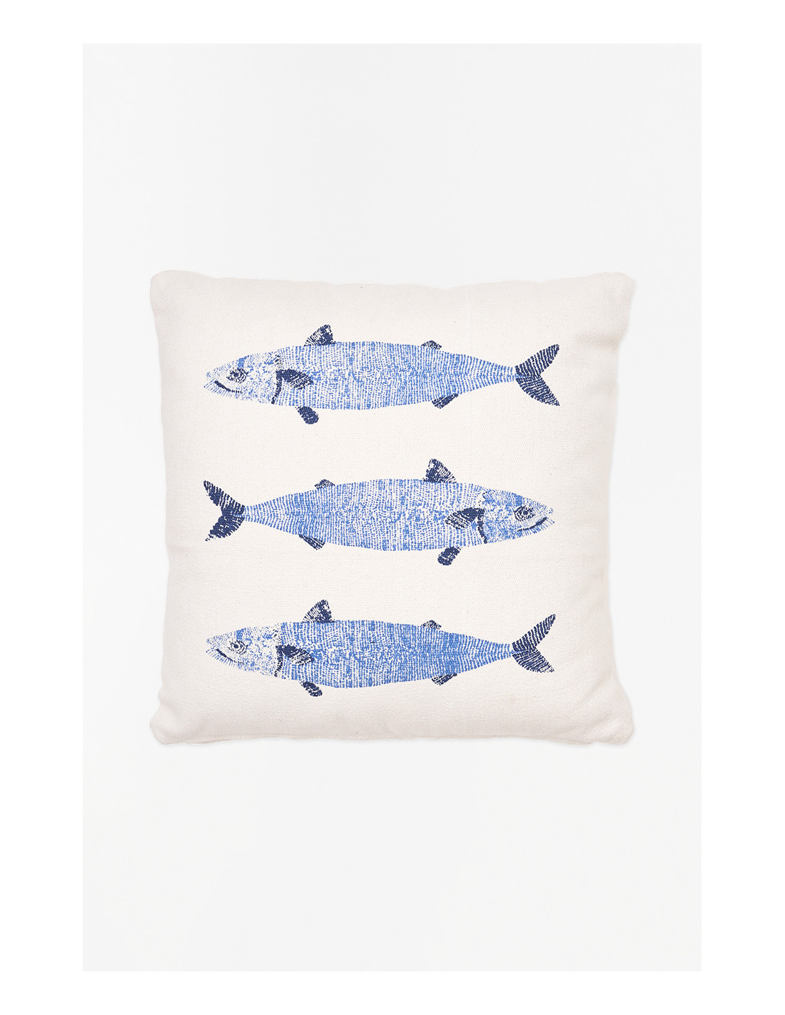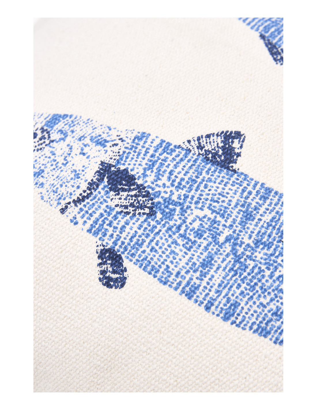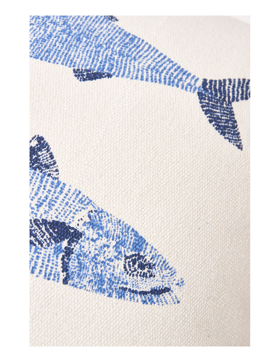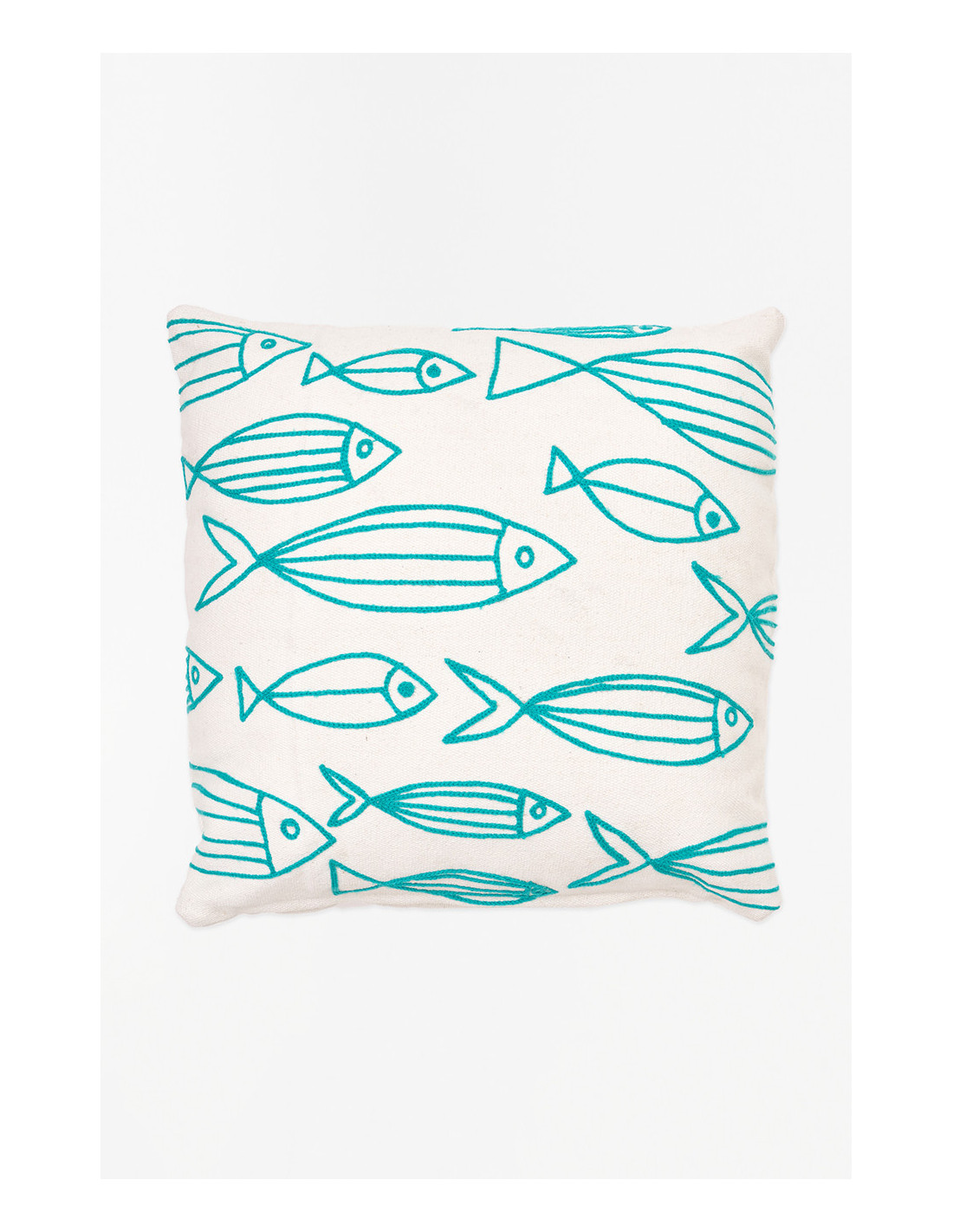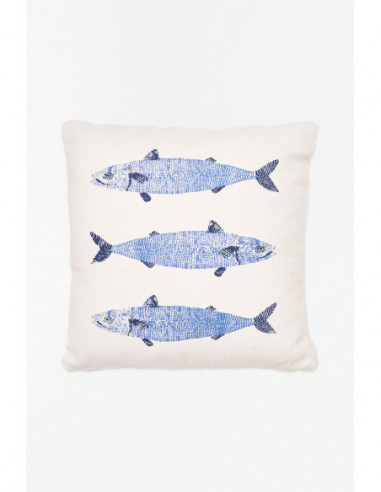 Cojín elaborado en algodón de alta calidad, presenta un diseño marino que captura el movimiento fluido de los peces en el agua. Disponible en dos variantes: una con fondo azul intenso y un banco de peces blancos que resalta con estilo y sobriedad, y otra opción con peces en distintas tonalidades de azul o celeste sobre fondo claro, ideal para espacios luminosos.