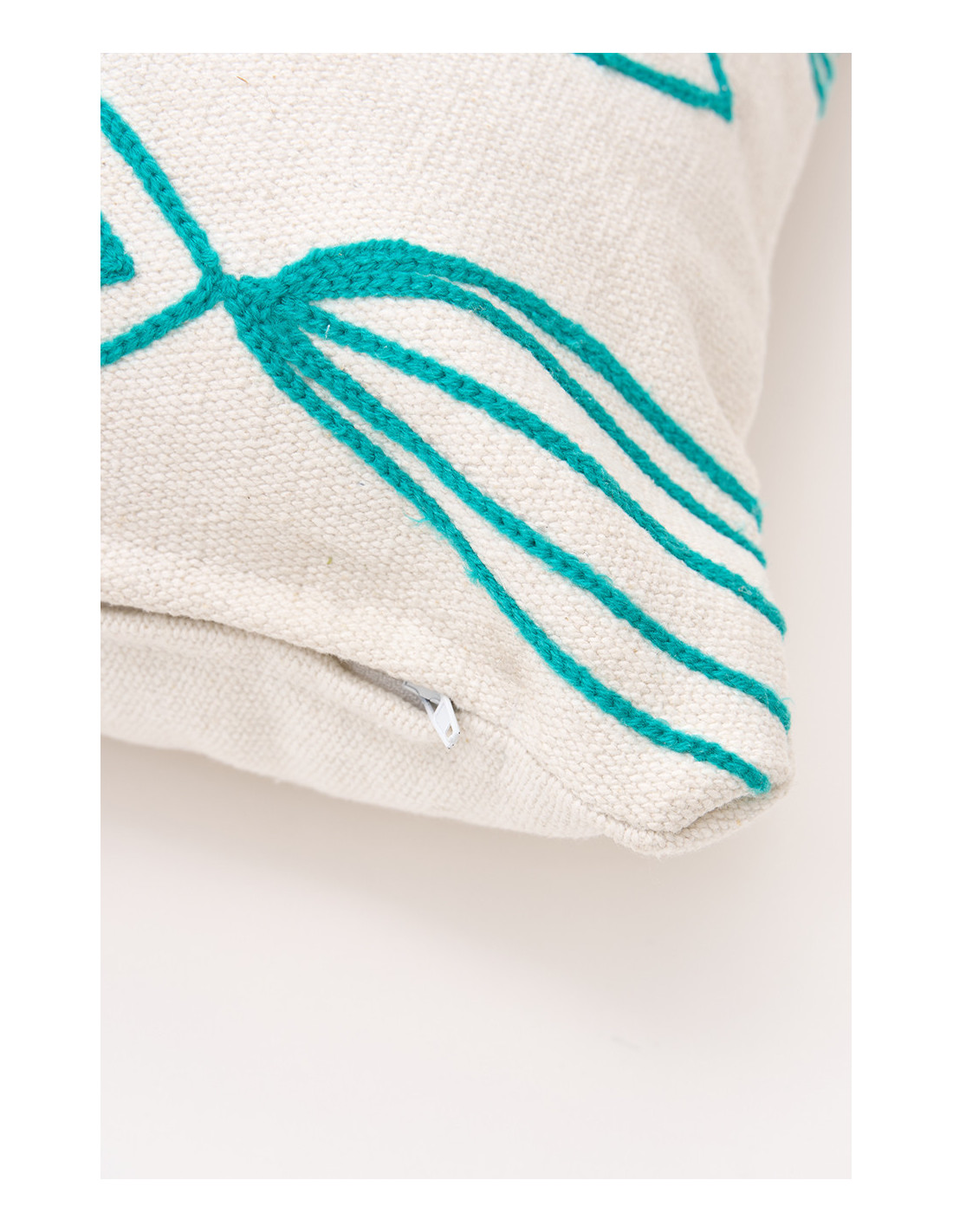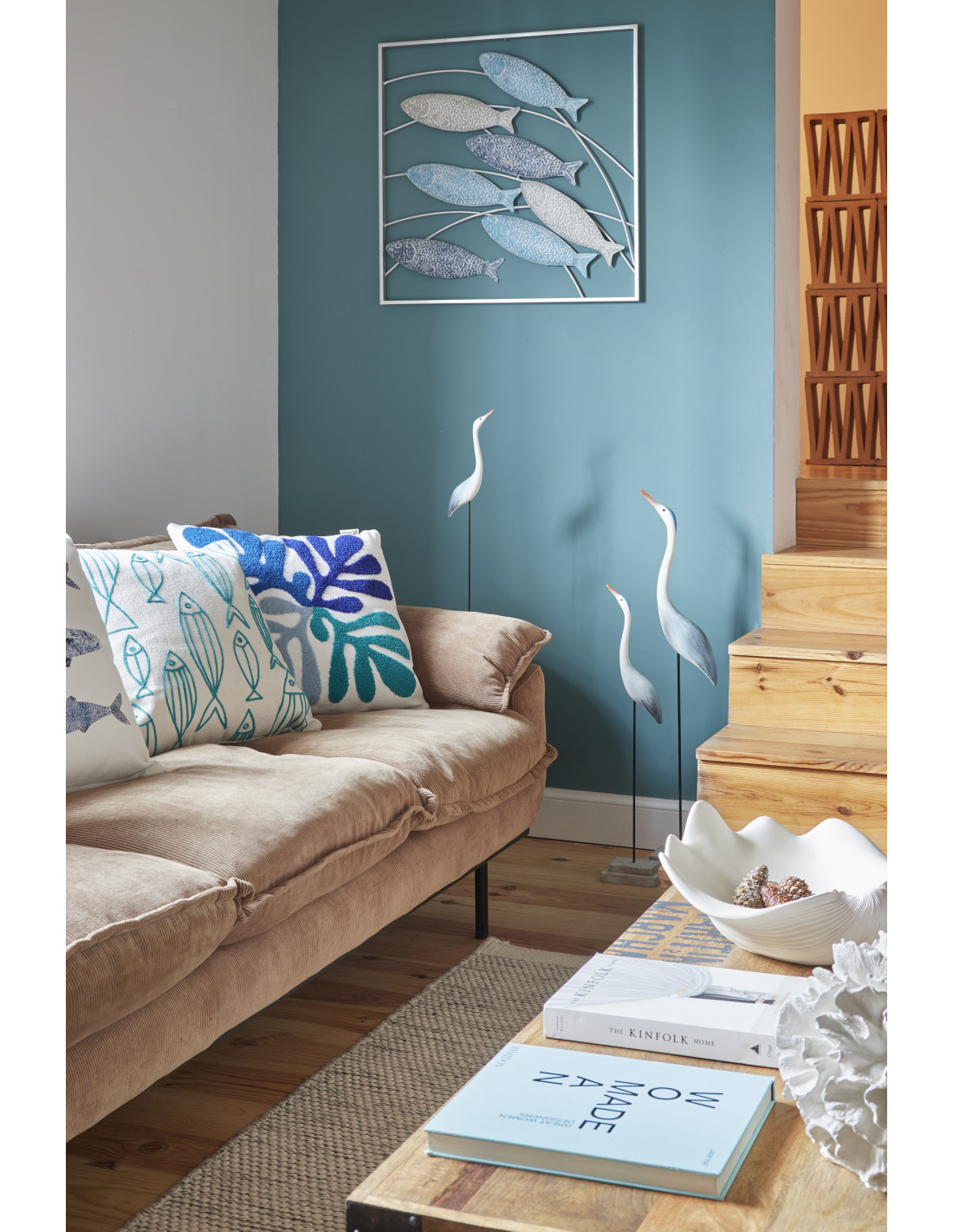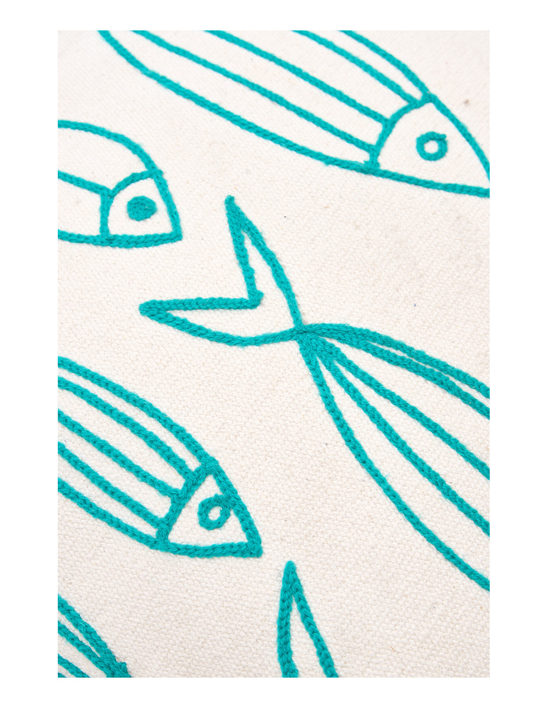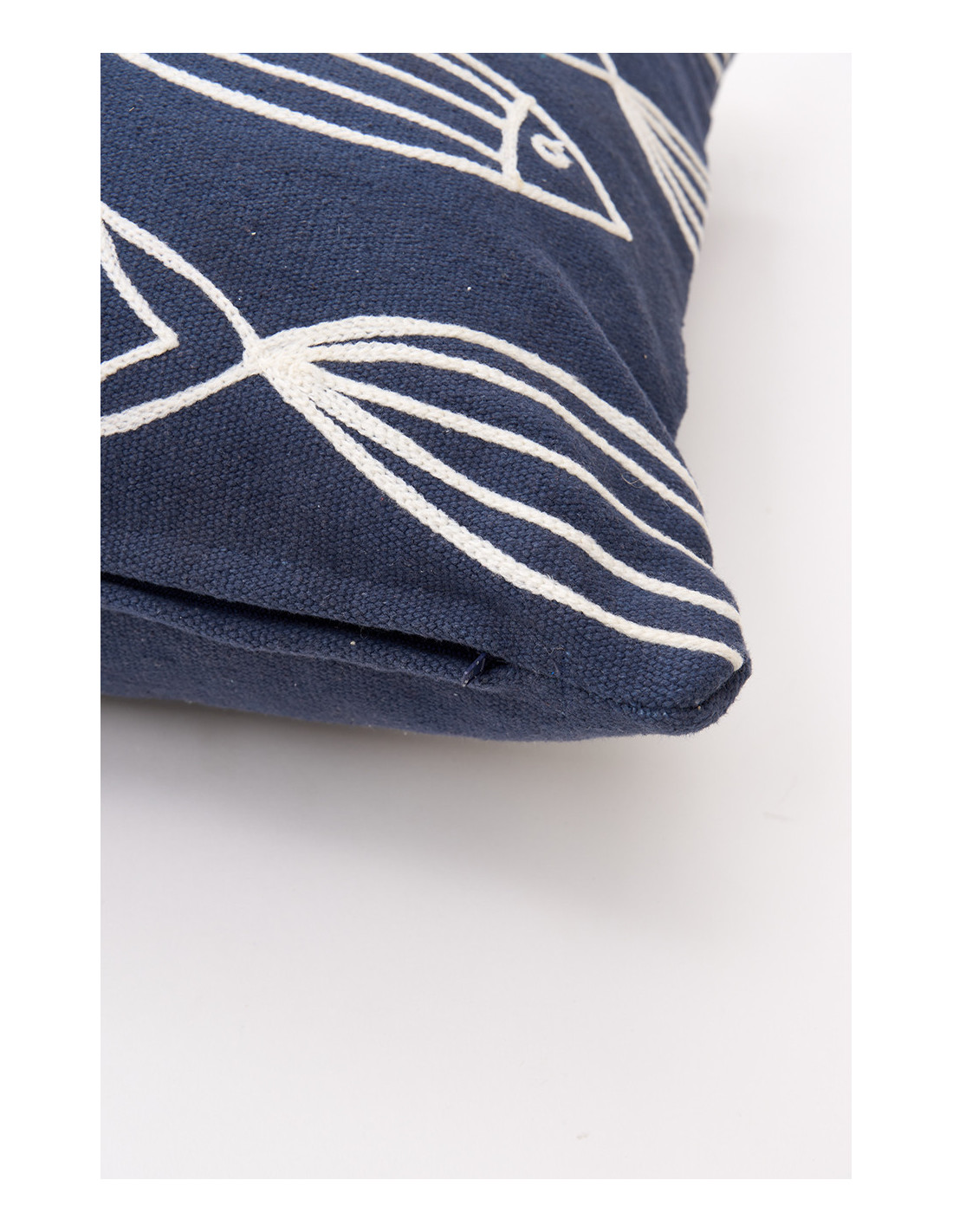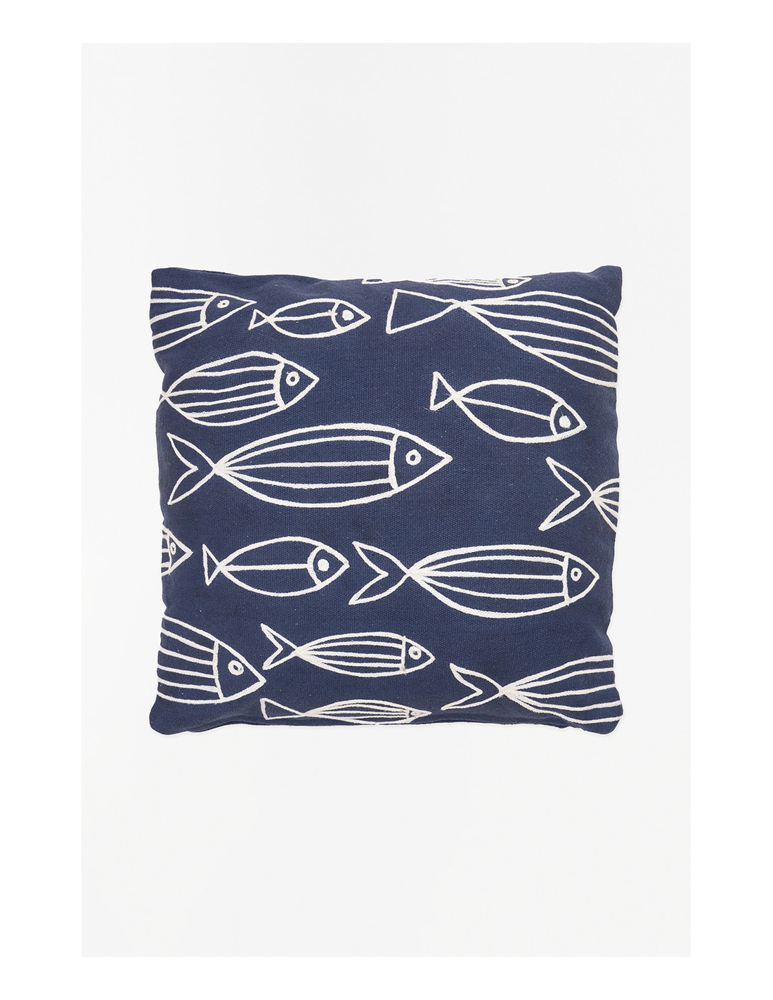 Cojín elaborado en algodón de alta calidad, presenta un diseño marino que captura el movimiento fluido de los peces en el agua. Disponible en dos variantes: una con fondo azul intenso y un banco de peces blancos que resalta con estilo y sobriedad, y otra opción con peces en distintas tonalidades de azul o celeste sobre fondo claro, ideal para espacios luminosos.