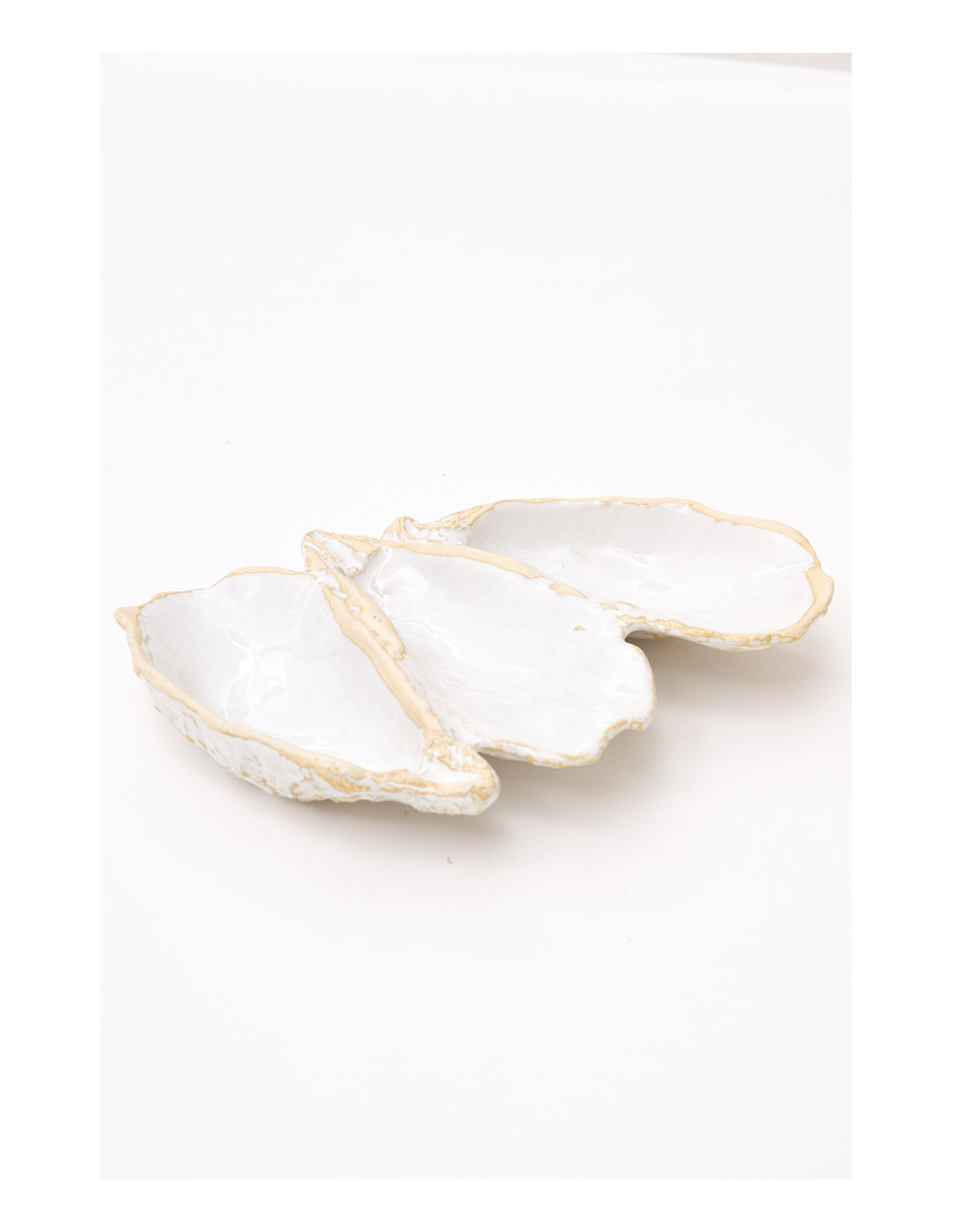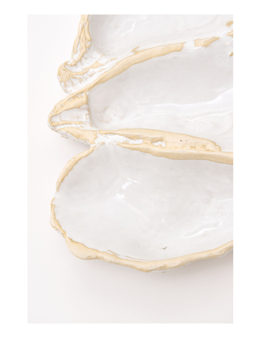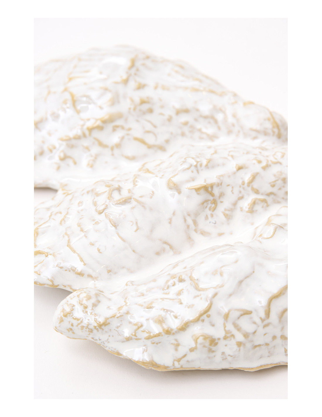 Elegante cuenco en cerámica esmaltada blanca, inspirado en la forma de una ostra. Ideal para servir pequeñas porciones. Venta individual.