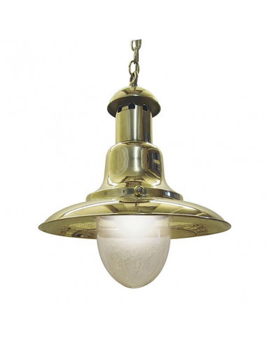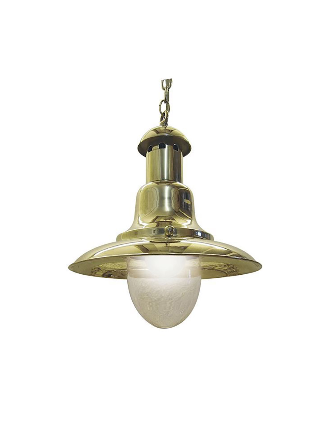 Lámpara de pescador náutica para colgar con acabado latón macizo brillante elaborada en artesanía marinera con piezas metálicas en latón y repulsadas en el torno.