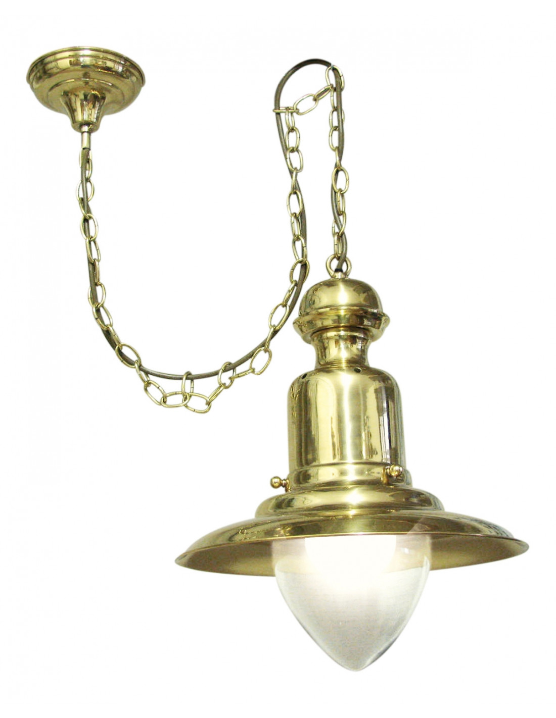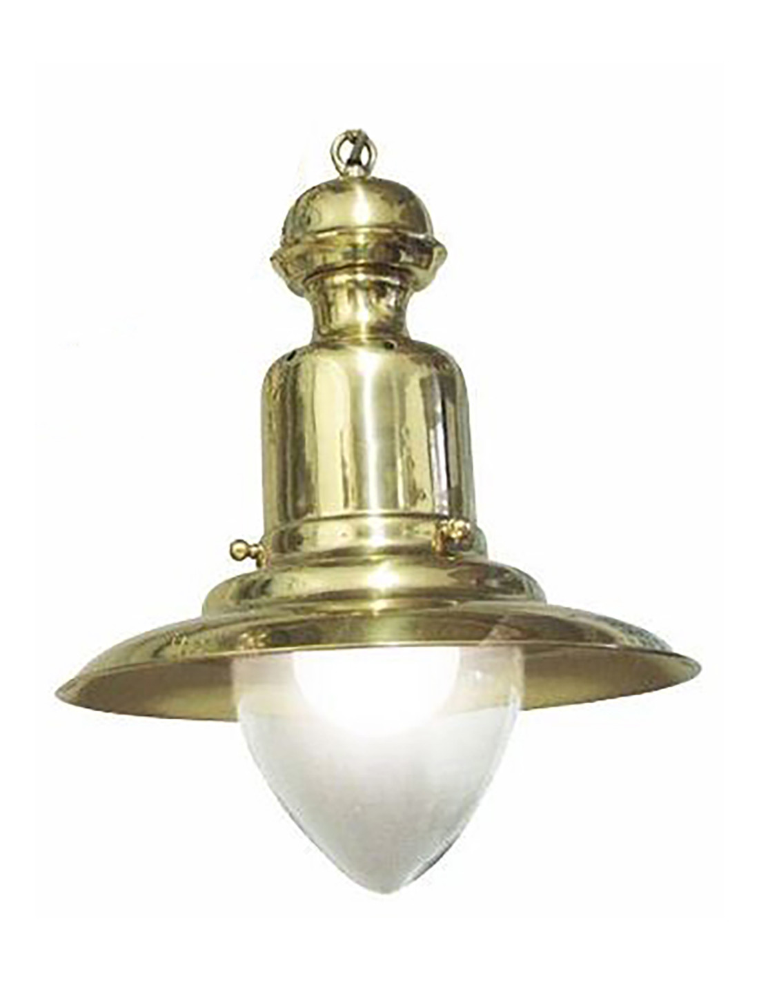 Lámpara de pescador náutica de techo con cadena para colgar con acabado latón brillante elaborada en artesanía marinera con piezas metálicas en latón y repulsadas en el torno.