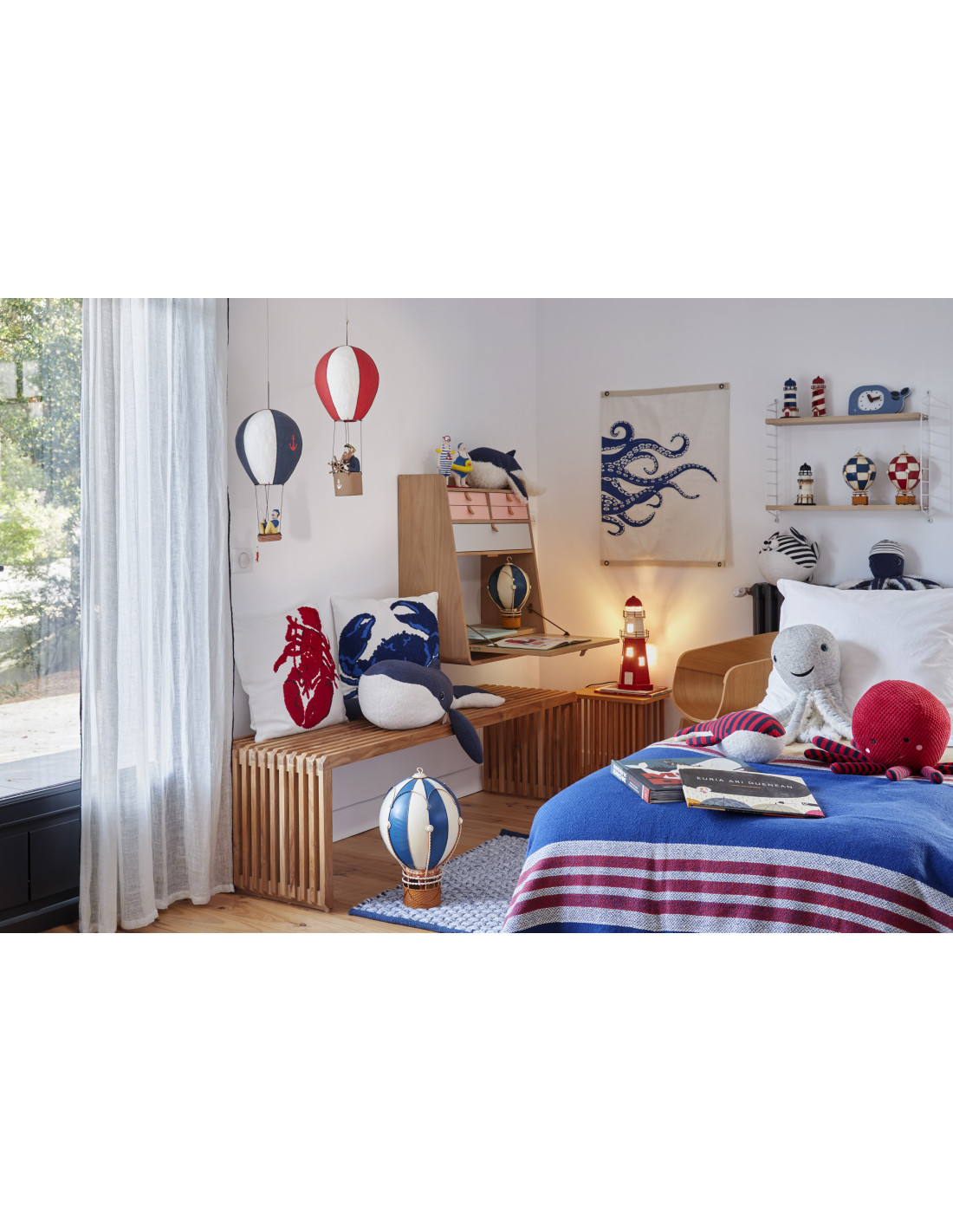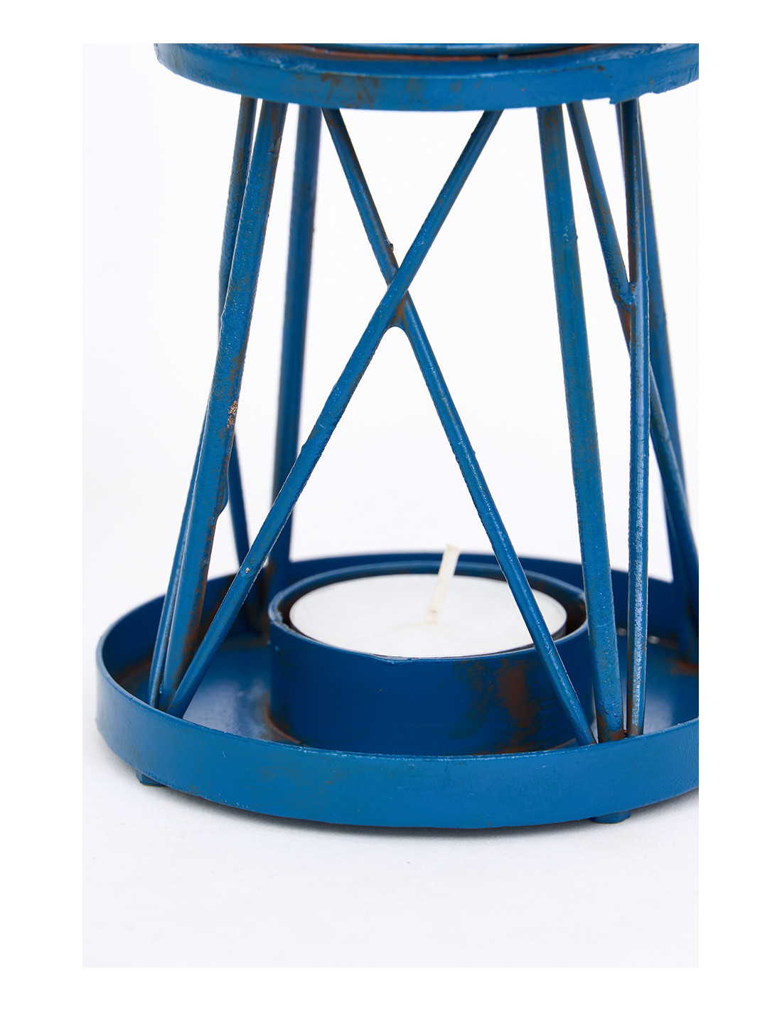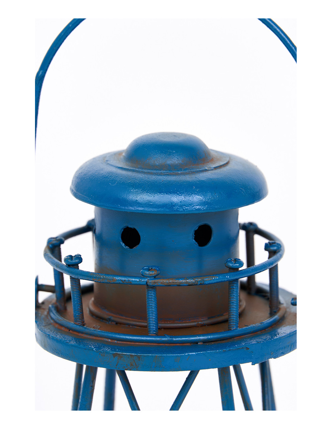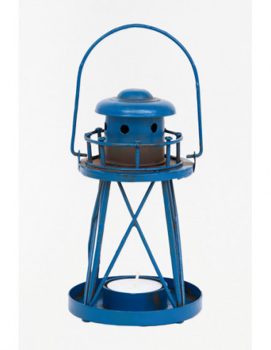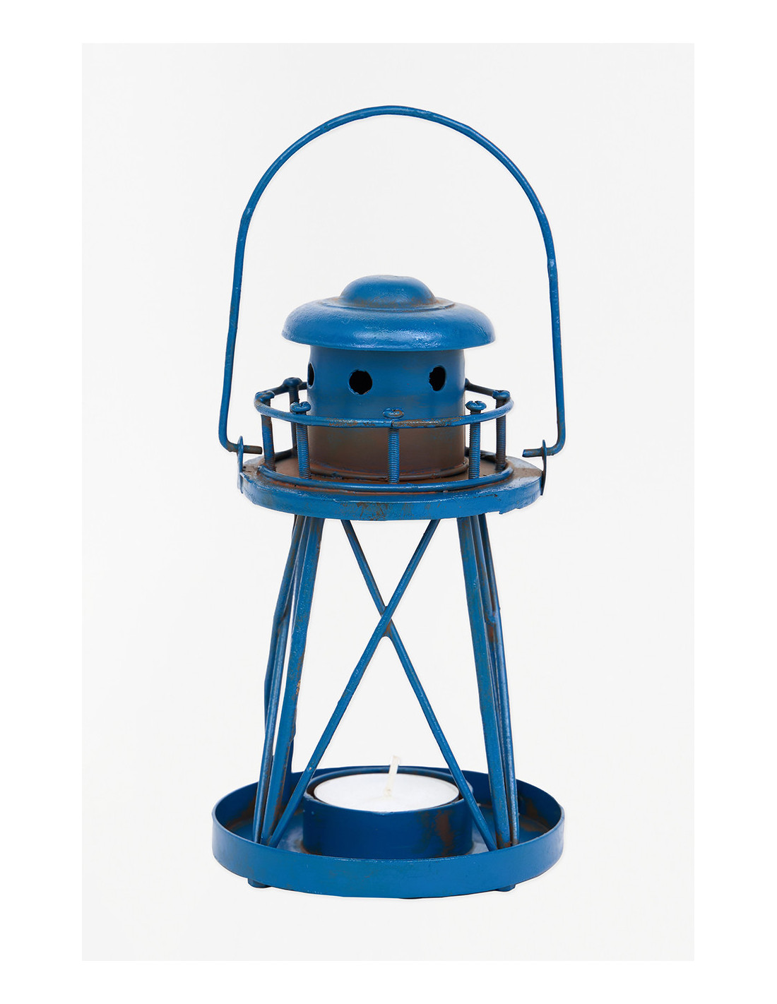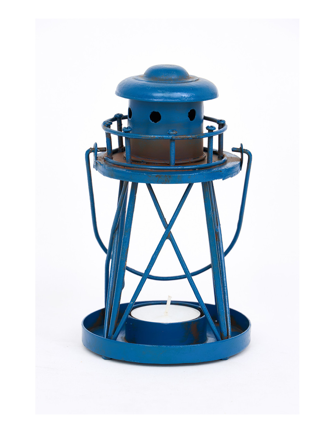 Confeccionado en metal trabajado, este portavelas de inspiración náutica destaca por su estética envejecida y su tono azul desgastado, que aporta carácter y calidez. La forma de faro, combinada con el acabado intencionadamente rústico, lo convierte en un accesorio perfecto para ambientar espacios con un aire marítimo y nostálgico.