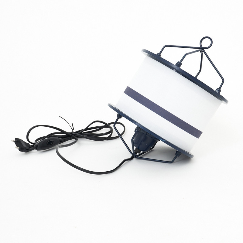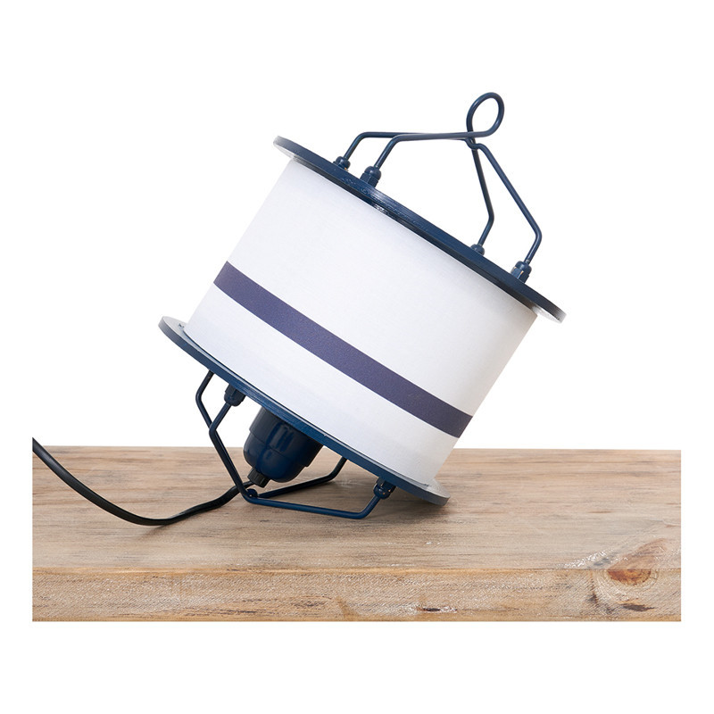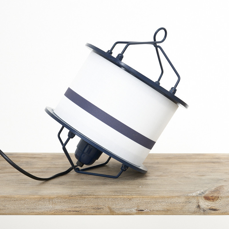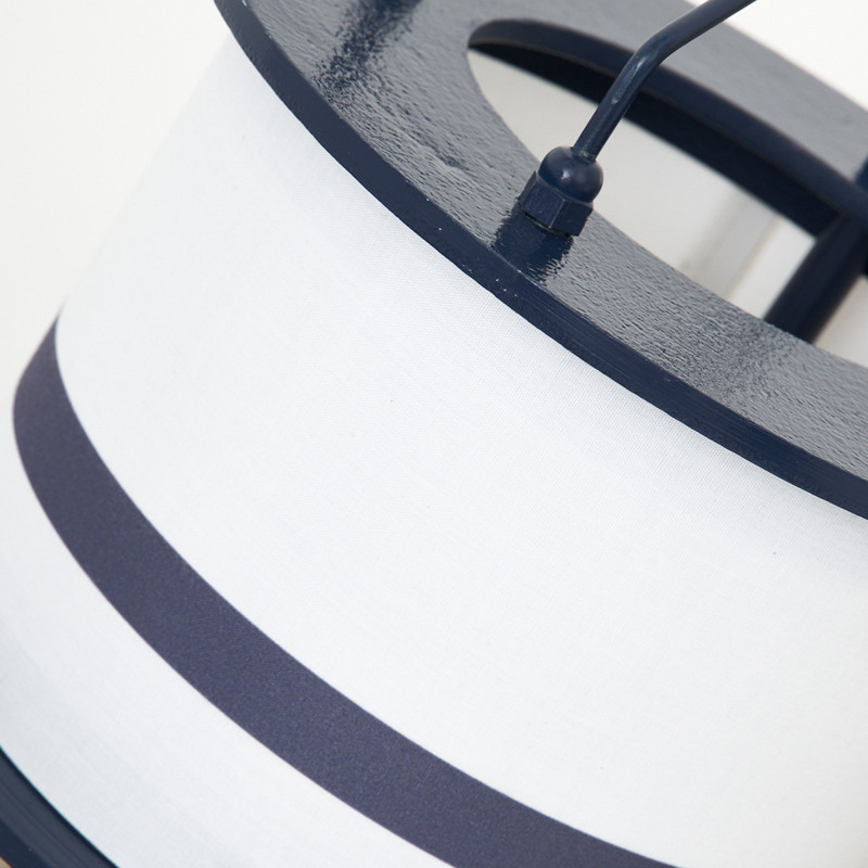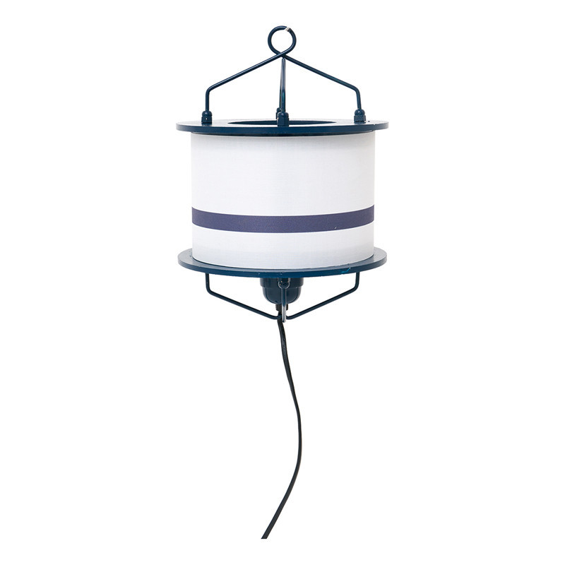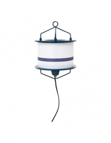Lámpara marinera en metal con diseño vintage y formas redondas. Hecha a mano en artesanía náutica de metal y pintada en tonos marineros blanco y azul marino. Dispone de instalación eléctrica. Admite el uso de bombillas incandescentes, bombillas LED o de bajo consumo no incluidas. Perfecta para complementar la decoración marinera de una terraza, restaurante u hotel de temática marinera.