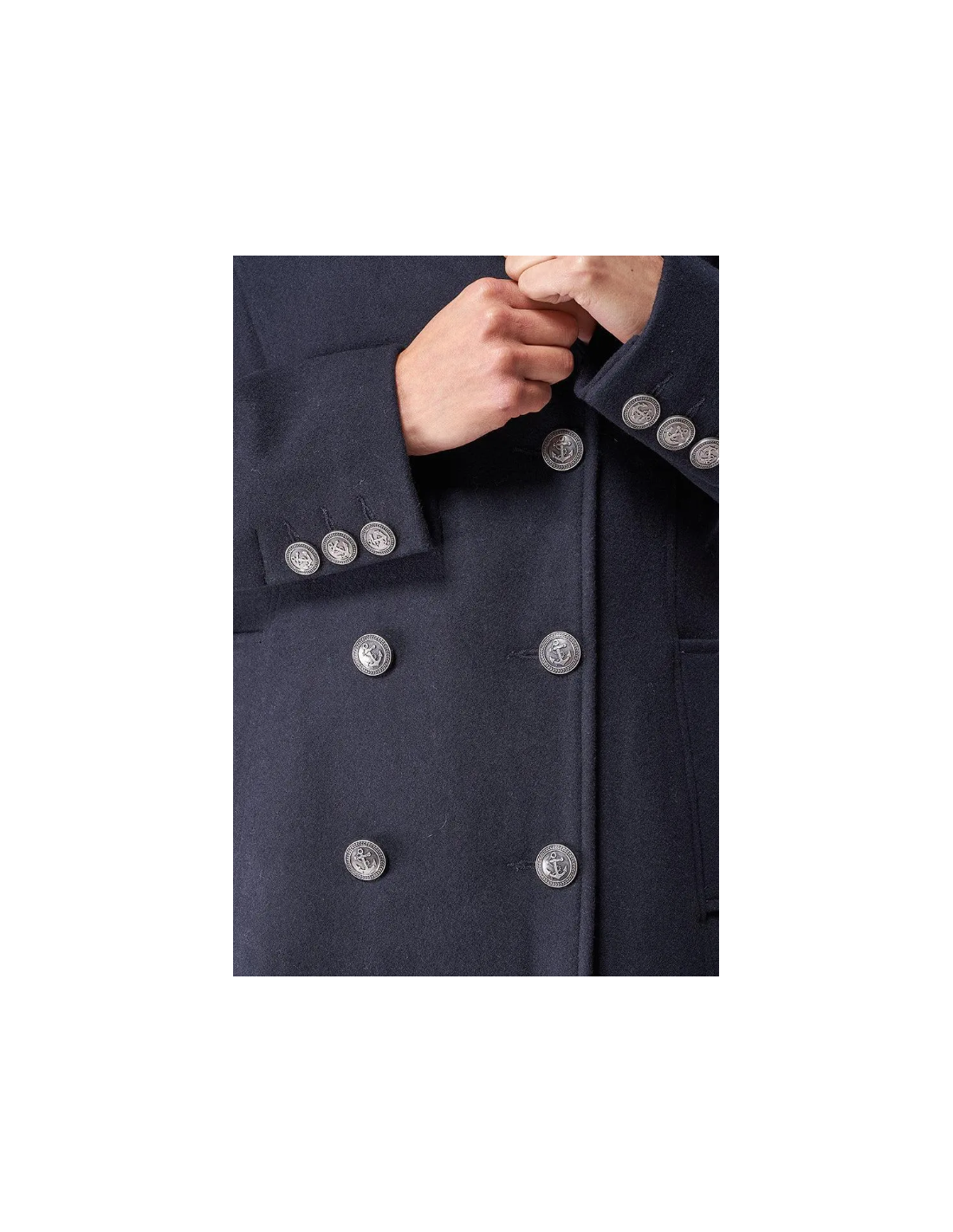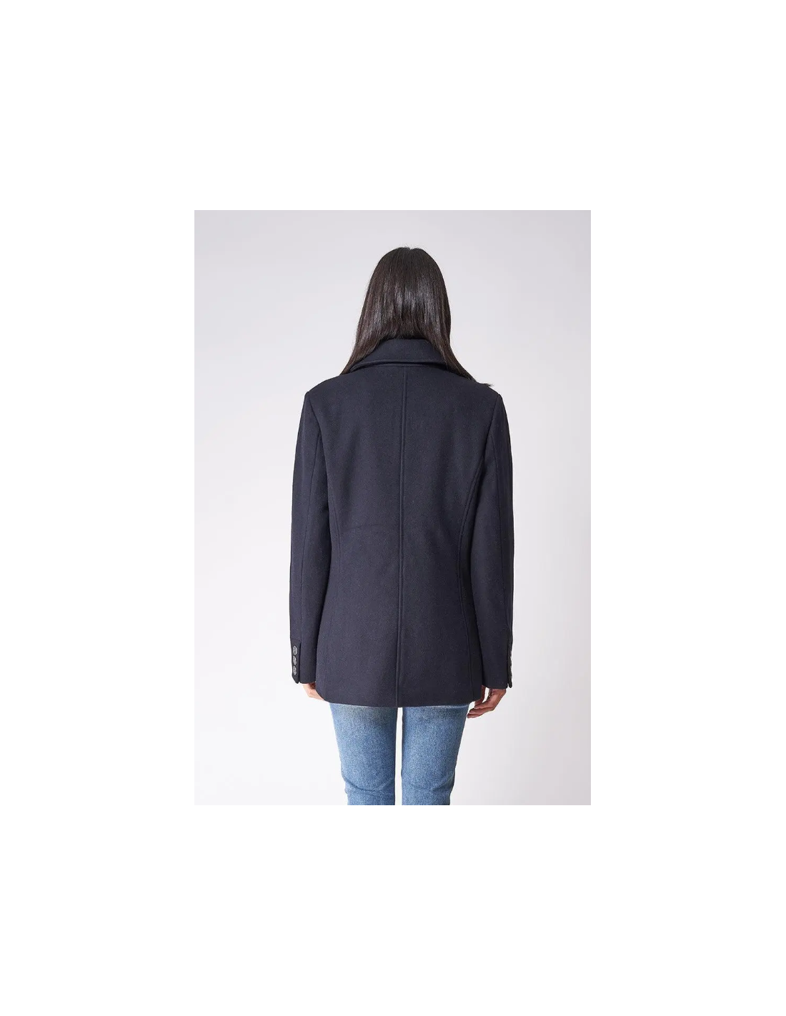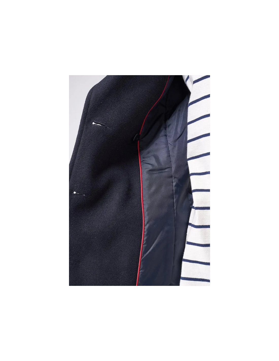 Tabardo náutico de mujer BATELA confeccionado en mezcla de lana y poliamida. Disponible en color azul marino, con apertura de botones de paño que le dan un toque marinero elegante a la prenda. Chaquetón marinero mujer de amplias solapas, entallado al cuerpo, con bolsillos y mangas largas abotonadas en los puños. Prenda de estilo marinero, adecuada para el uso diario en la temporada invernal.