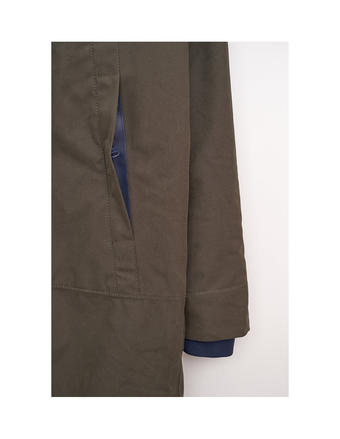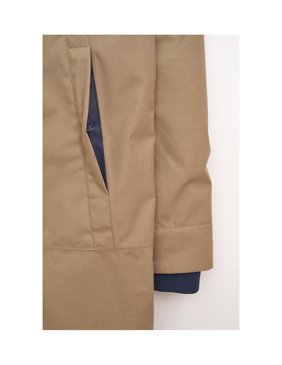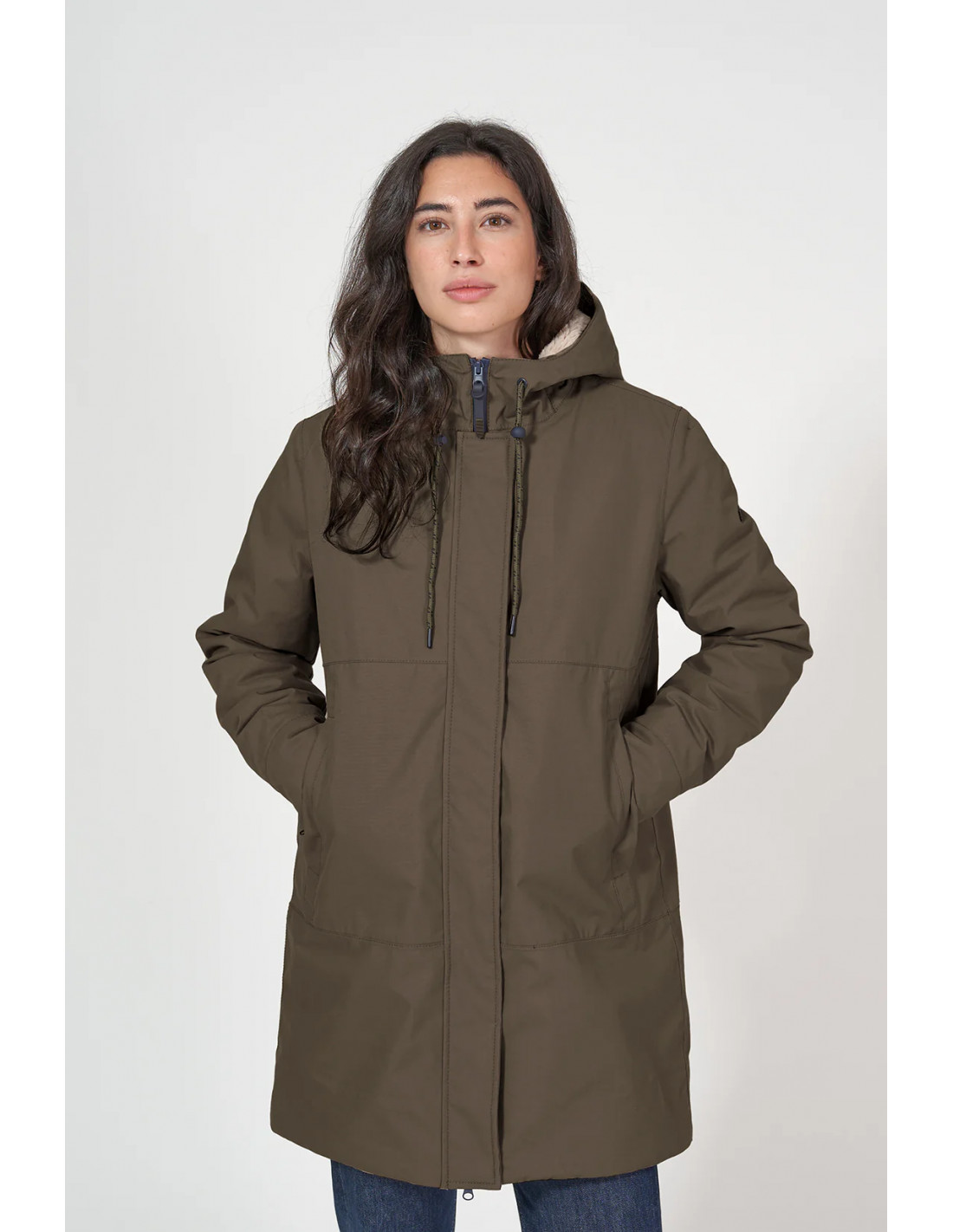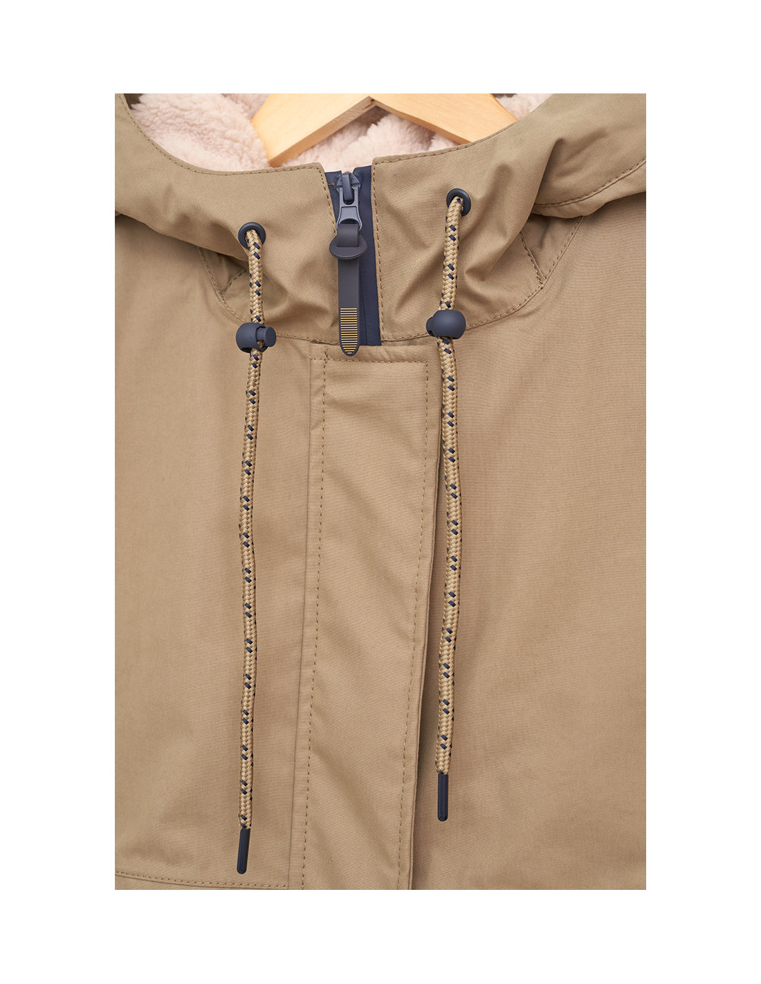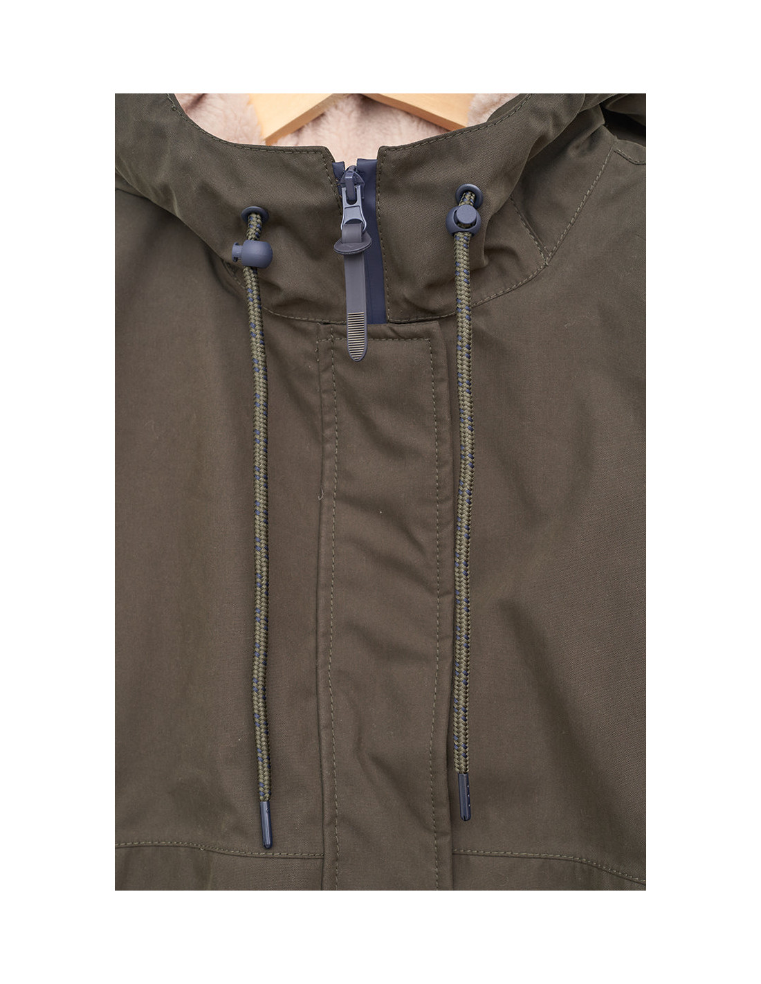 Chaqueta Abrigo con forro interior de borreguito, bolsillos laterales, capucha con cordones regulables y cremallera con tapeta que cierra con corchetes.