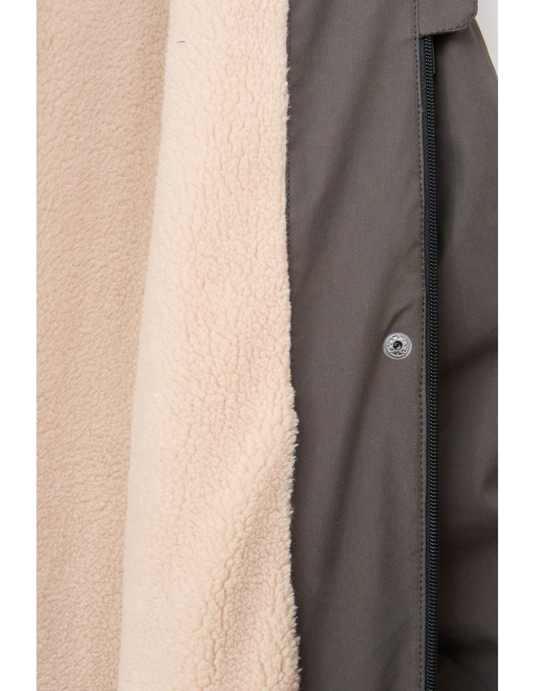 Chaqueta Abrigo con forro interior de borreguito, bolsillos laterales, capucha con cordones regulables y cremallera con tapeta que cierra con corchetes.