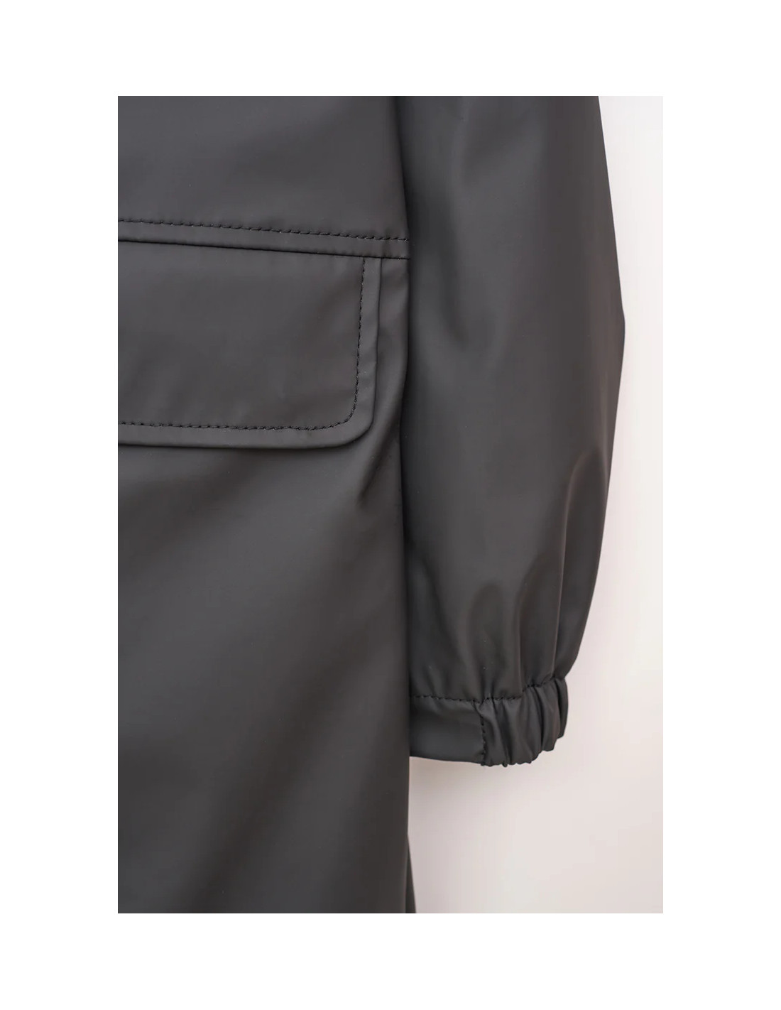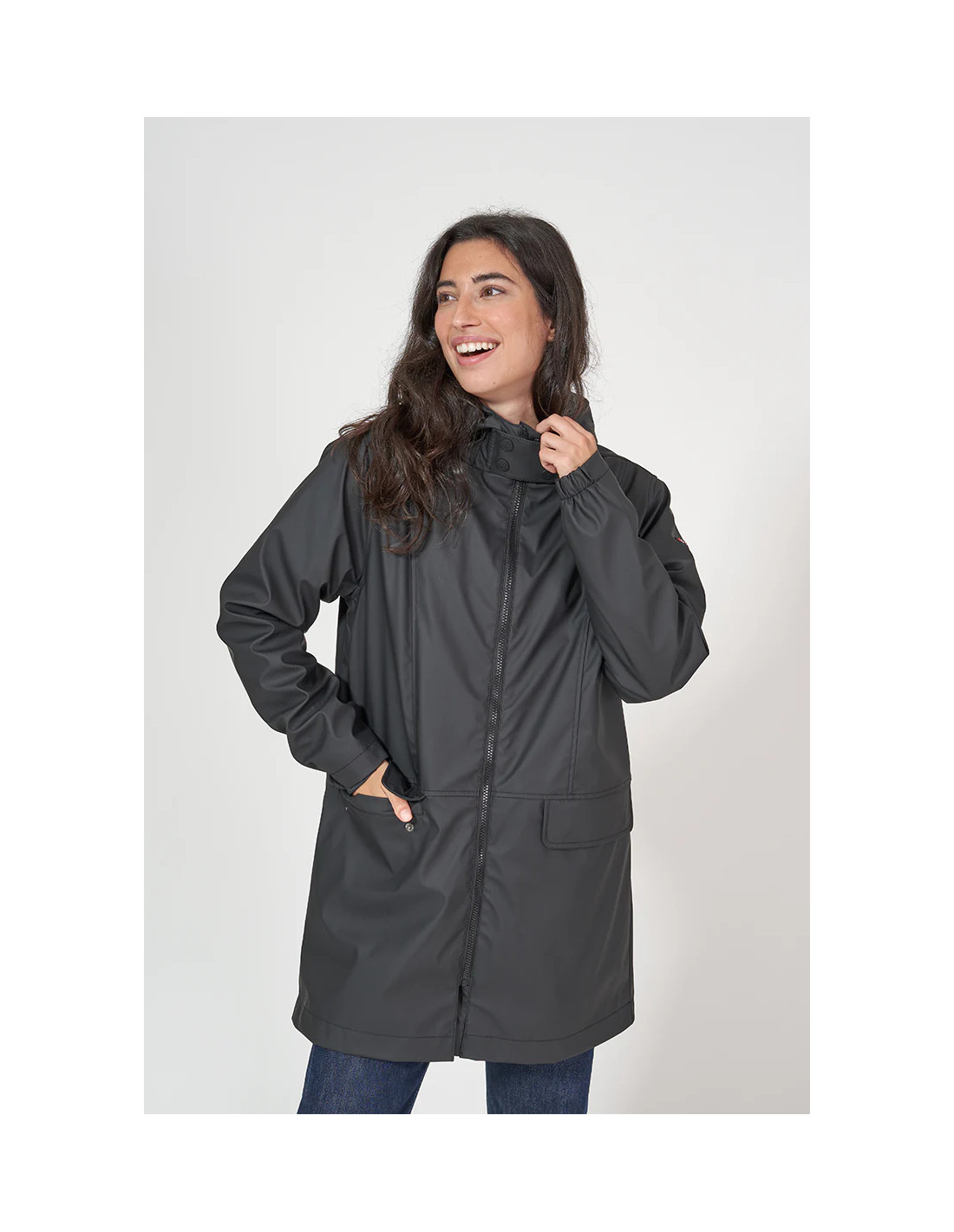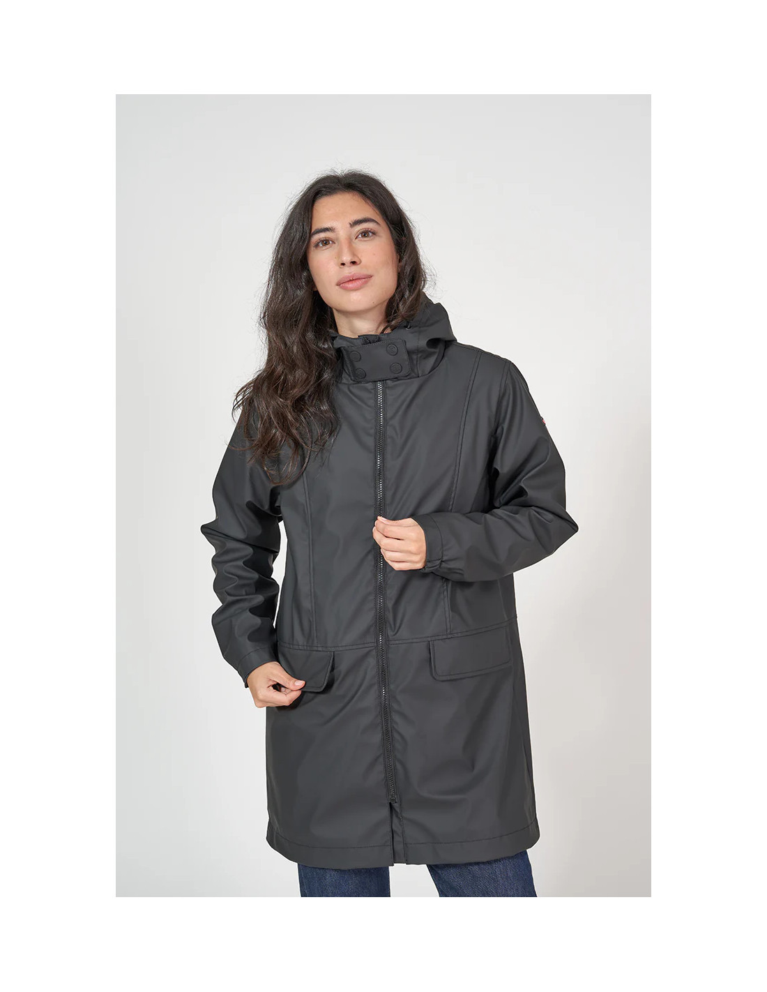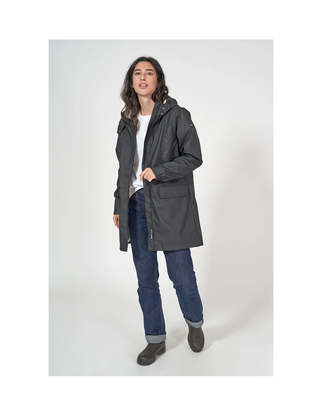Chubasquero marinero largo de mujer de la prestigiosa marca de ropa Batela. Ha sido confeccionado en poliuretano con forro interno de piel de oveja y con capucha. Diseño frontal liso con cremallera y bolsillos.