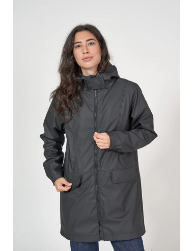 Chubasquero náutico mujer Batela con forro interno de piel de oveja y diseño marinero. Presenta apertura frontal por cremallera. Resistente al agua, cortavientos, dispone de bolsillos solapas laterales, cuello con cierre de botones, además de capucha protectora. Chaqueta chubasquero marinero largo, de diseño recto en poliuretano en tono Tempest.