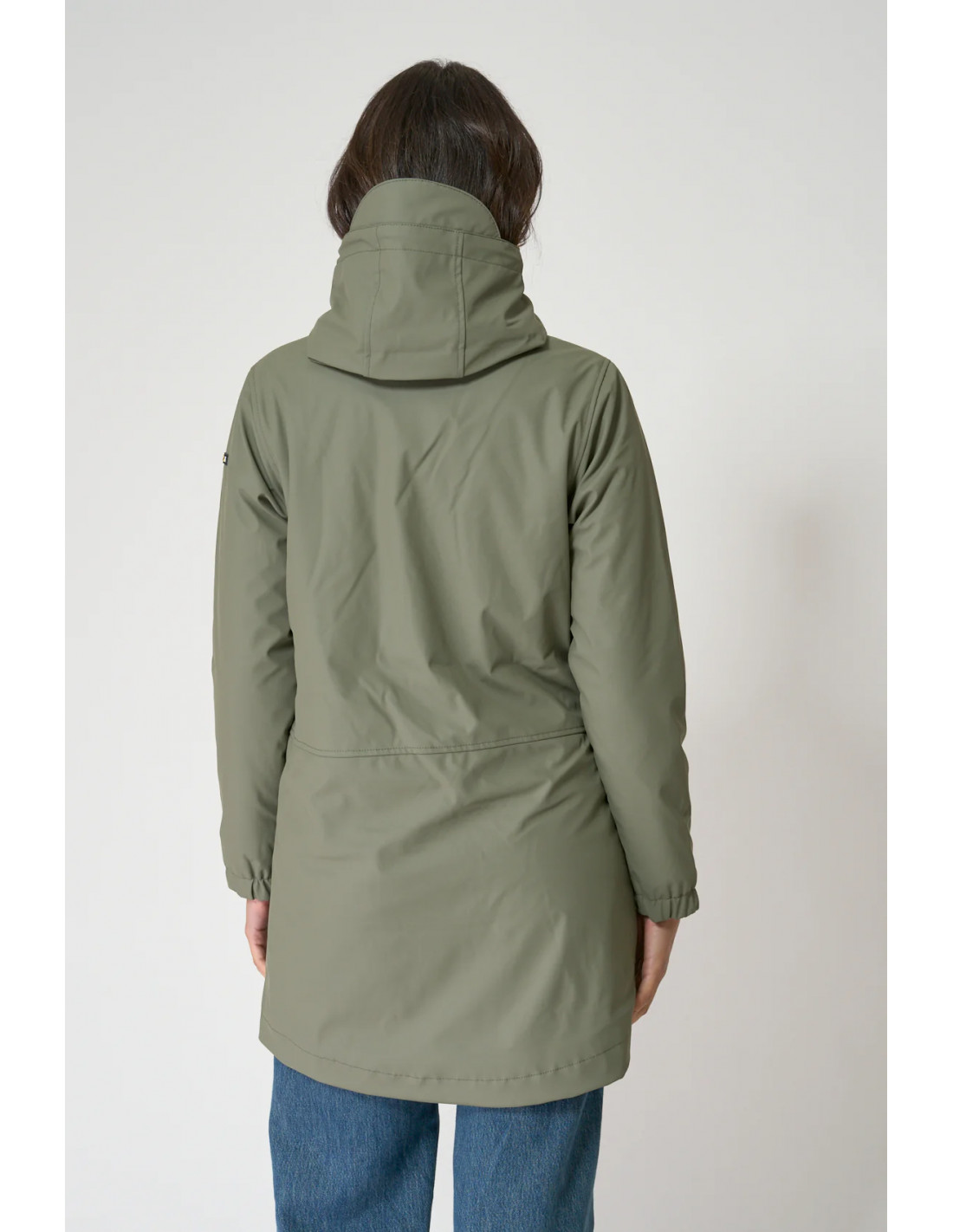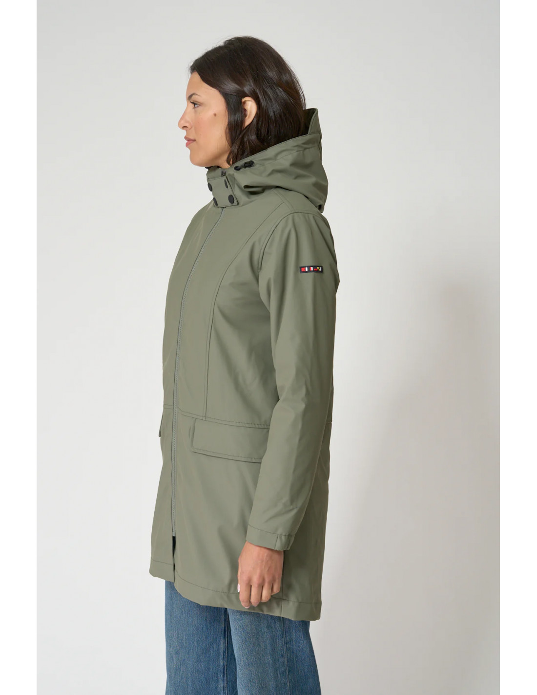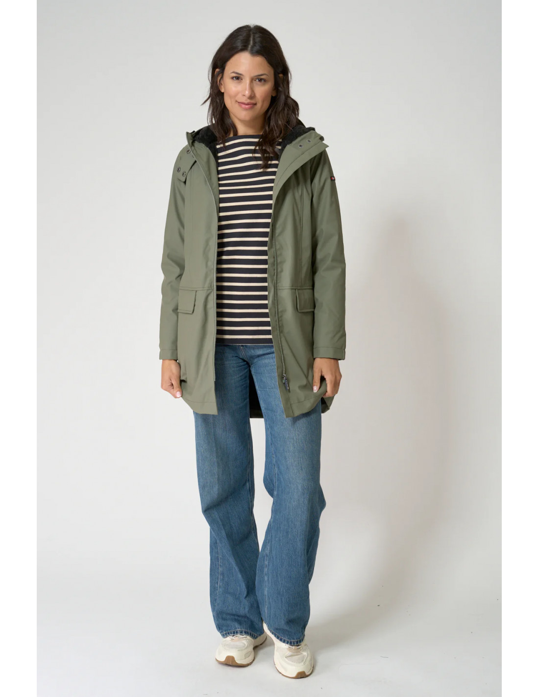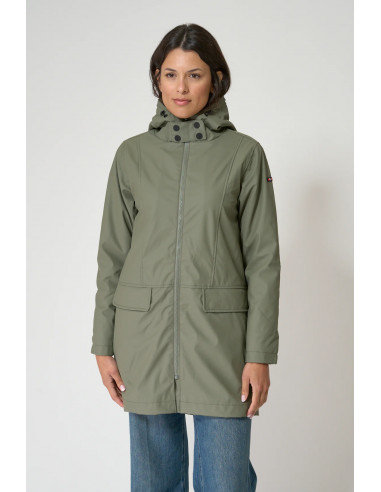 Chubasquero náutico mujer Batela con forro interno de piel de oveja y diseño marinero. Presenta apertura frontal por cremallera. Resistente al agua, cortavientos, dispone de bolsillos solapas laterales, cuello con cierre de botones, además de capucha protectora. Chaqueta chubasquero marinero largo, de diseño recto en poliuretano en tono Tempest.