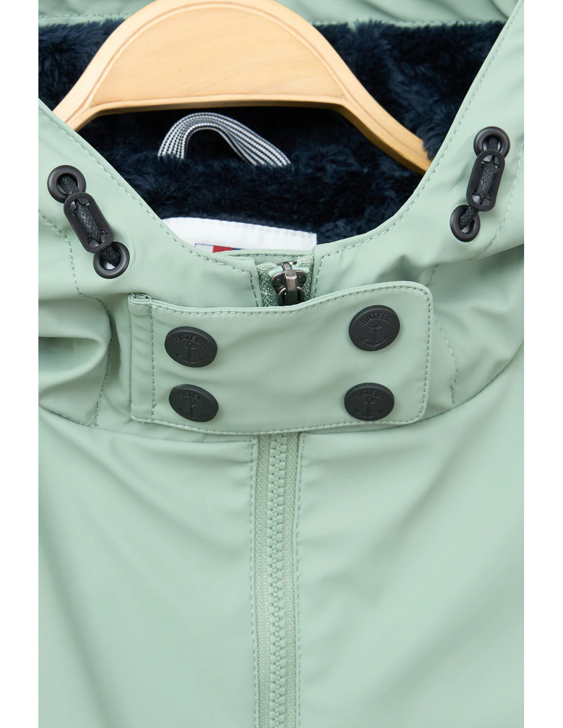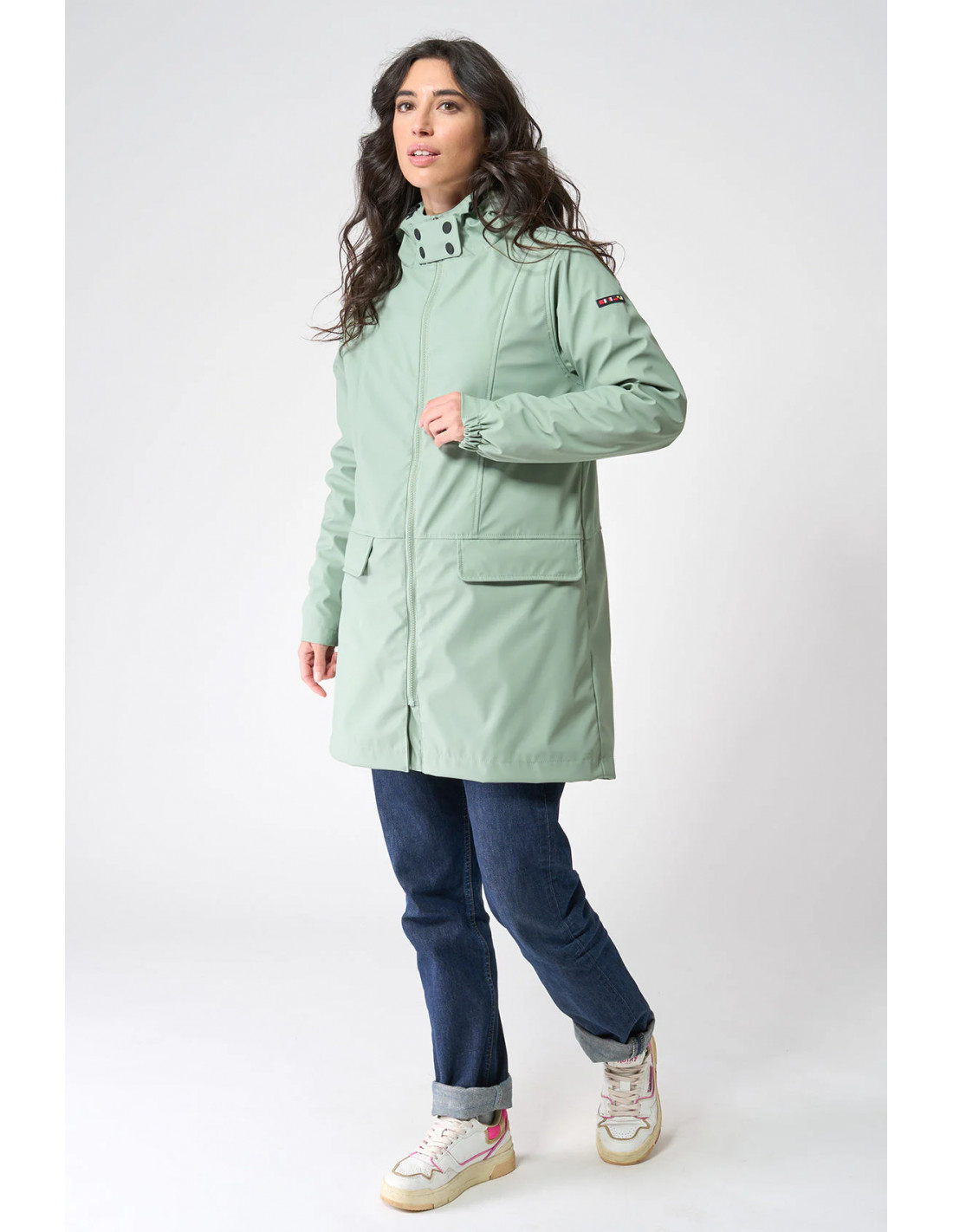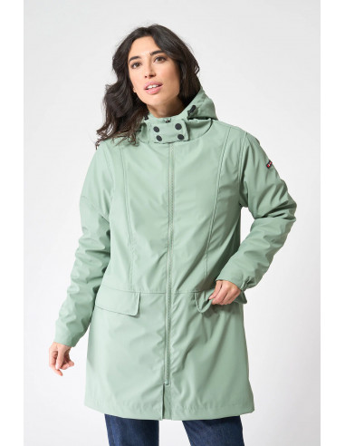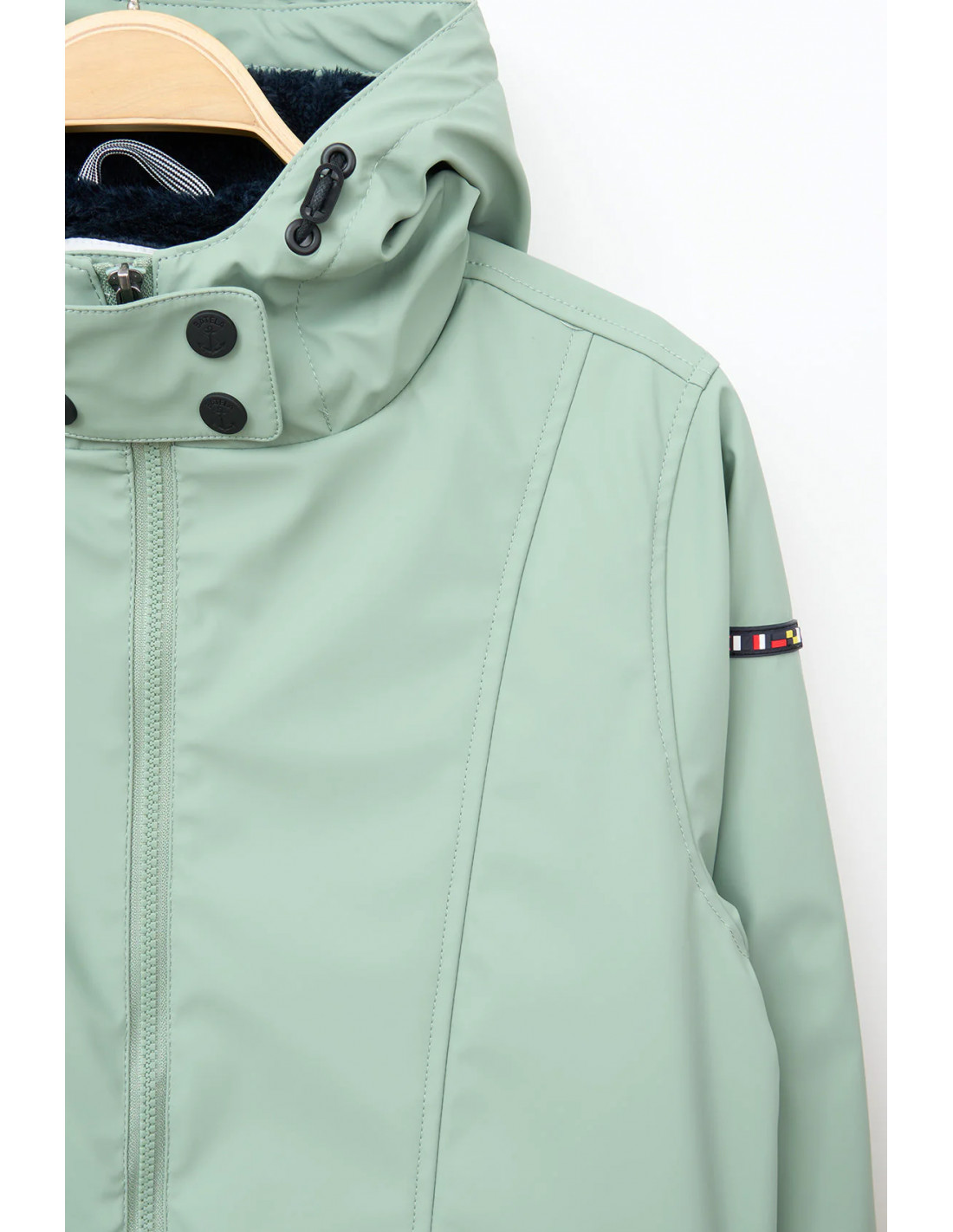 Chubasquero náutico mujer Batela con forro interno de piel de oveja y diseño marinero. Presenta apertura frontal por cremallera. Resistente al agua, cortavientos, dispone de bolsillos solapas laterales, cuello con cierre de botones, además de capucha protectora. Chaqueta chubasquero marinero largo, de diseño recto en poliuretano en tono Tempest.
