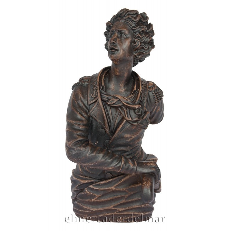 Mascarón de proa de barco La Officer fabricado en resina de poliéster, pintado y patinado para darle aspecto de cobre envejecido. Es una elegante pieza decorativa que lucirá perfecta en rincones y espacios amplios para una decoración marinera clásica.