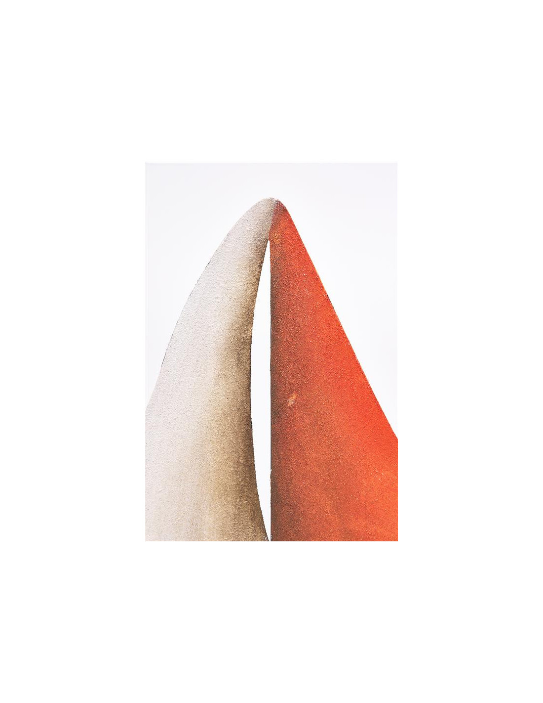 Elegante velero artesanal en tonos rojo y blanco, con base de madera envejecida y velas unidas con metal.