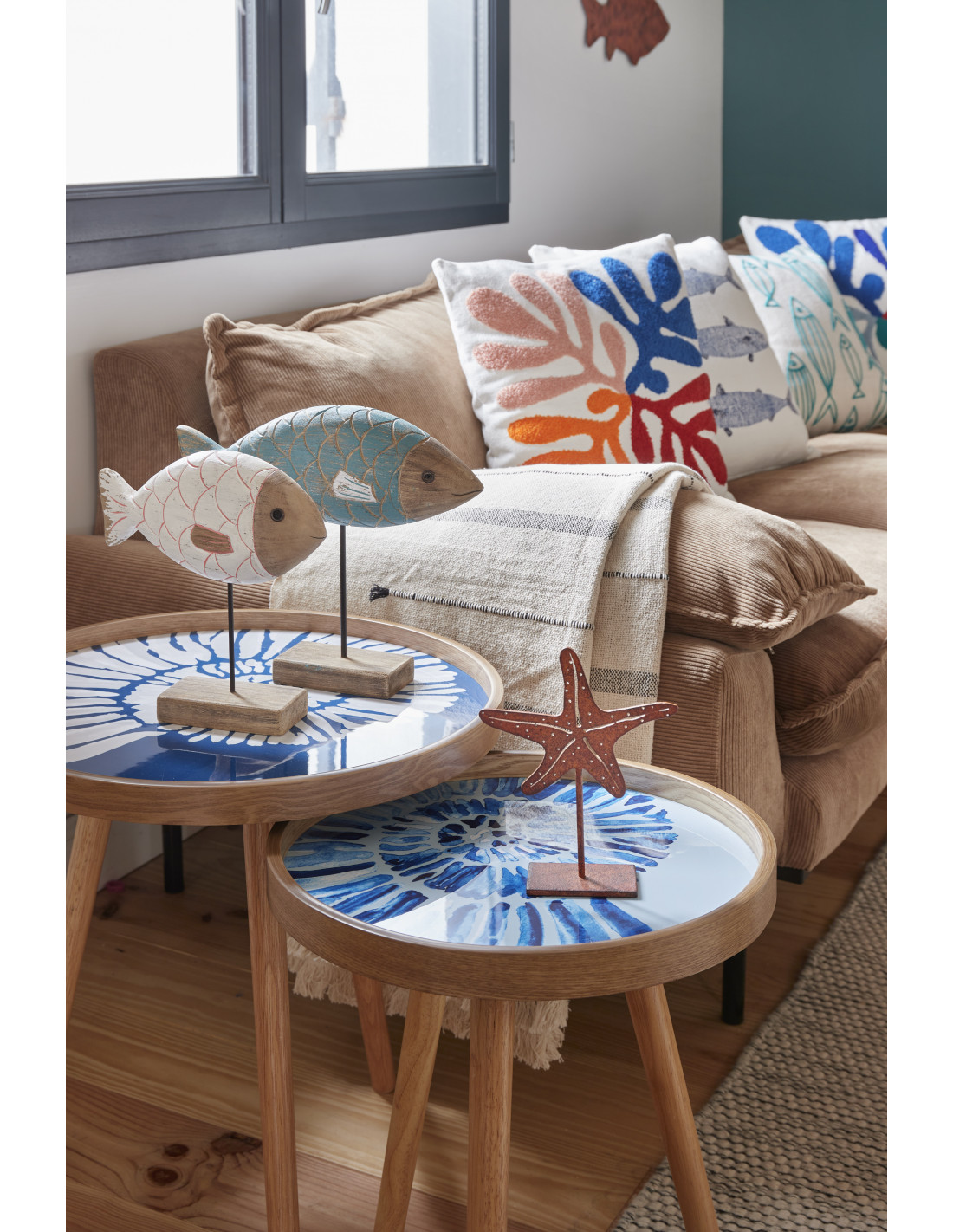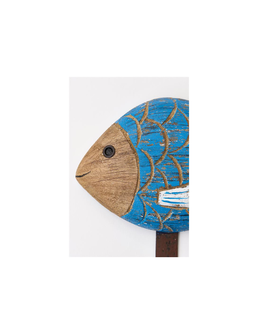 Con un diseño inspirado en el mar, este perchero de madera destaca por su acabado artesanal y su combinación de colores en azul, turquesa y blanco. Cada pez ha sido meticulosamente tallado y pintado para aportar un efecto vintage y natural.