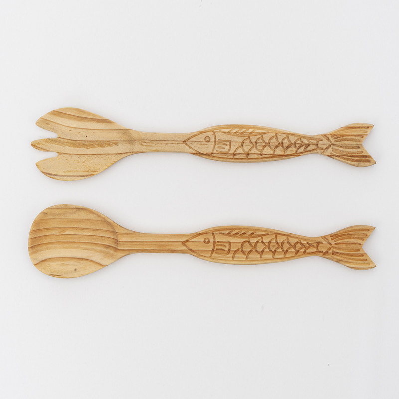 Juego de dos cubiertos pez para ensalada. Hecho en madera con dos graciosos peces grabados en ella.