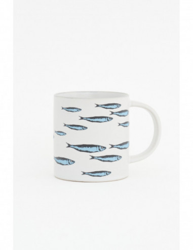 Taza de cerámica blanca con diseño de banco de peces: perfecta para tu café matutino, fácil de lavar y con un toque marino encantador.
