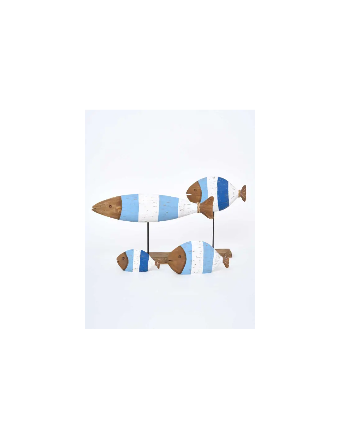 Figura decorativa de pez de madera con franjas azules y blancas y base natural de estilo marinero.