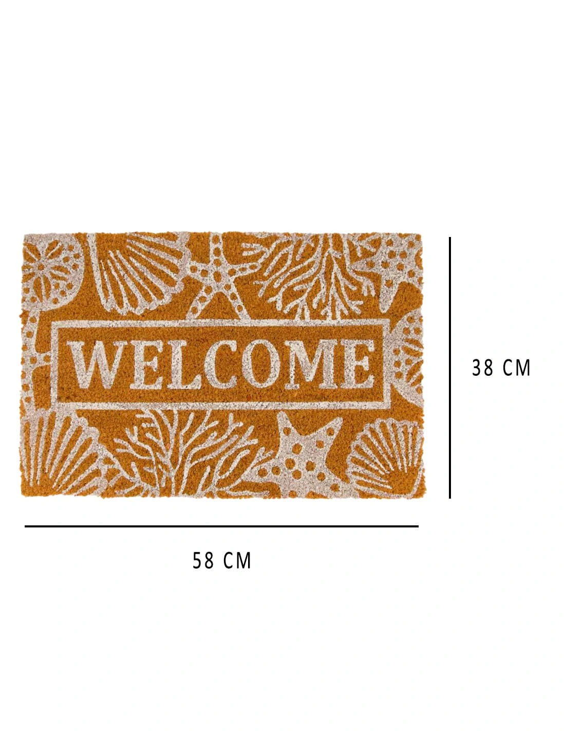 Felpudo de coco natural con “WELCOME” en blanco y motivo marino de conchas y estrellas de mar. Ideal para la entrada: retiene humedad y suciedad antes de entrar en casa.