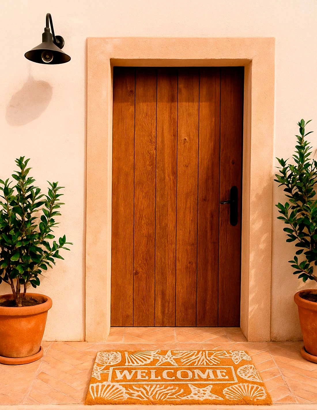 Un felpudo de entrada con esencia mediterránea, hecho con fibra de coco natural y decorado con la palabra “WELCOME” en blanco. La fibra de coco es un material muy valorado por su resistencia y por su función práctica: ayuda a limpiar el calzado y retener la humedad y la suciedad, manteniendo la entrada más cuidada.